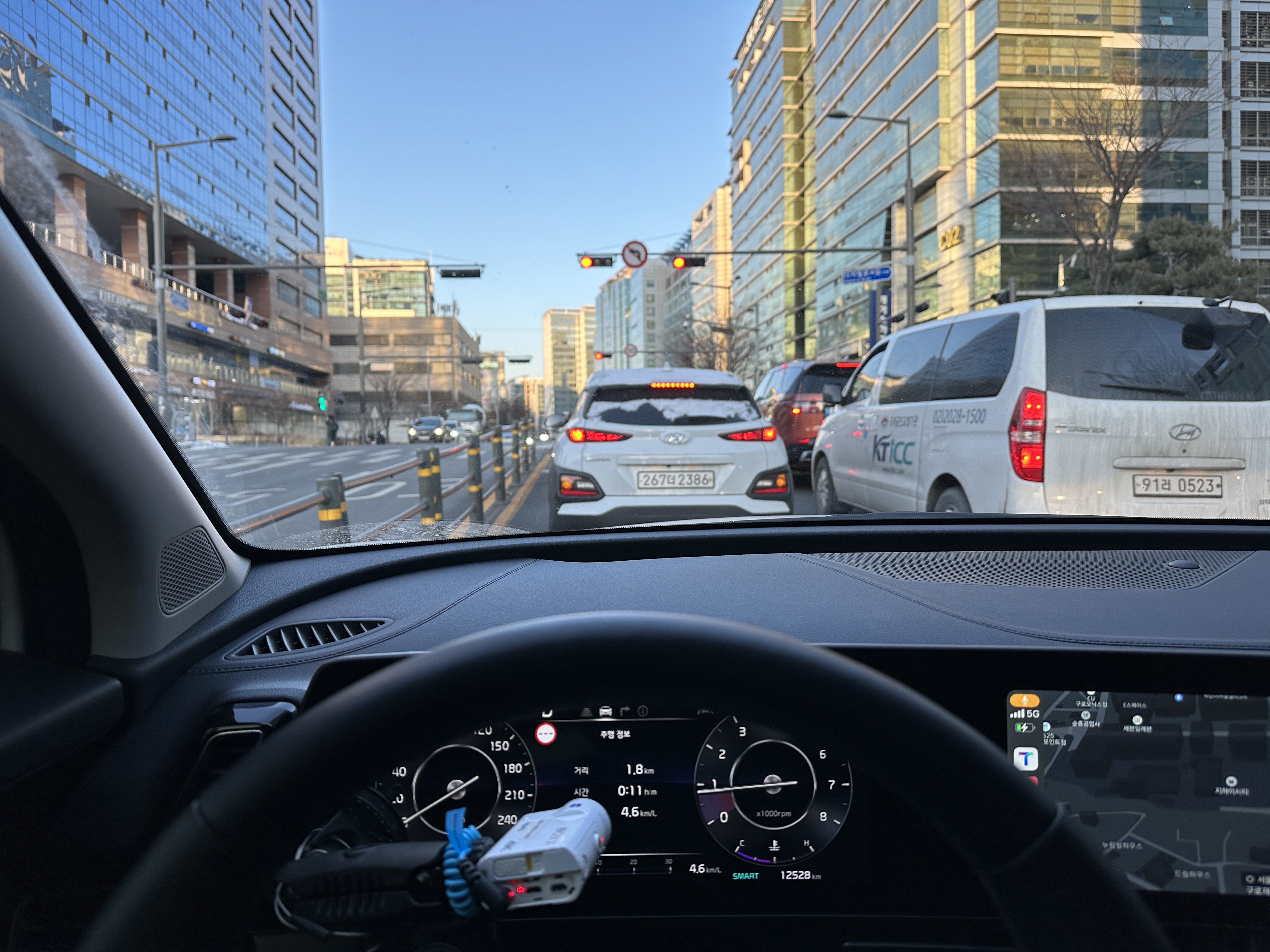 강남 퇴근길 연비테스트에 가장 큰 변수 지역은 바로 역삼역에서 삼성역 사이의 테헤란로이다. 이 곳은 약 2.3km 구간으로 안 막히면 평균 15분이면 주행 가능하지만 정말 많이 막히면 1시간 가까이 걸리는 곳이기도 하다. 참고로 사람이 이 구간을 걸어간다하더라도 25~30분이면 도달할 수 있는 거리기에 얼마나 막히는지 알 수가 있다.