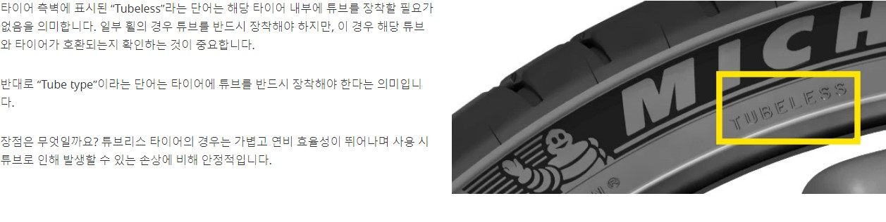 타이어 브랜드 바로 아래 혹은 옆에 타이어 측면에 Tubeless 라는 단어를 볼 수가 있는데 이는 타이어 내부에 튜브를 장착할 필요가 없다는 뜻이다.