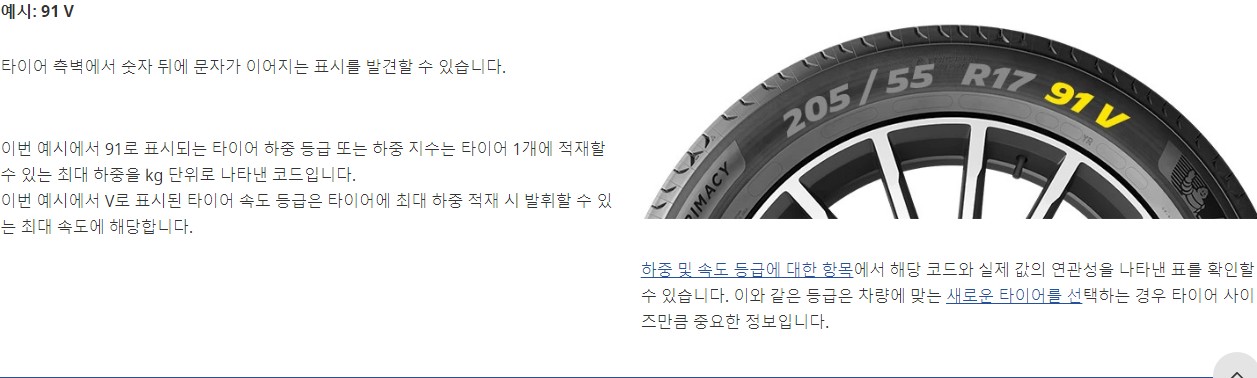 타이어 규격 다음으로 나타내는 타이어 숫자는 타이어 하중 등급과 타이어 속도 등급이다.