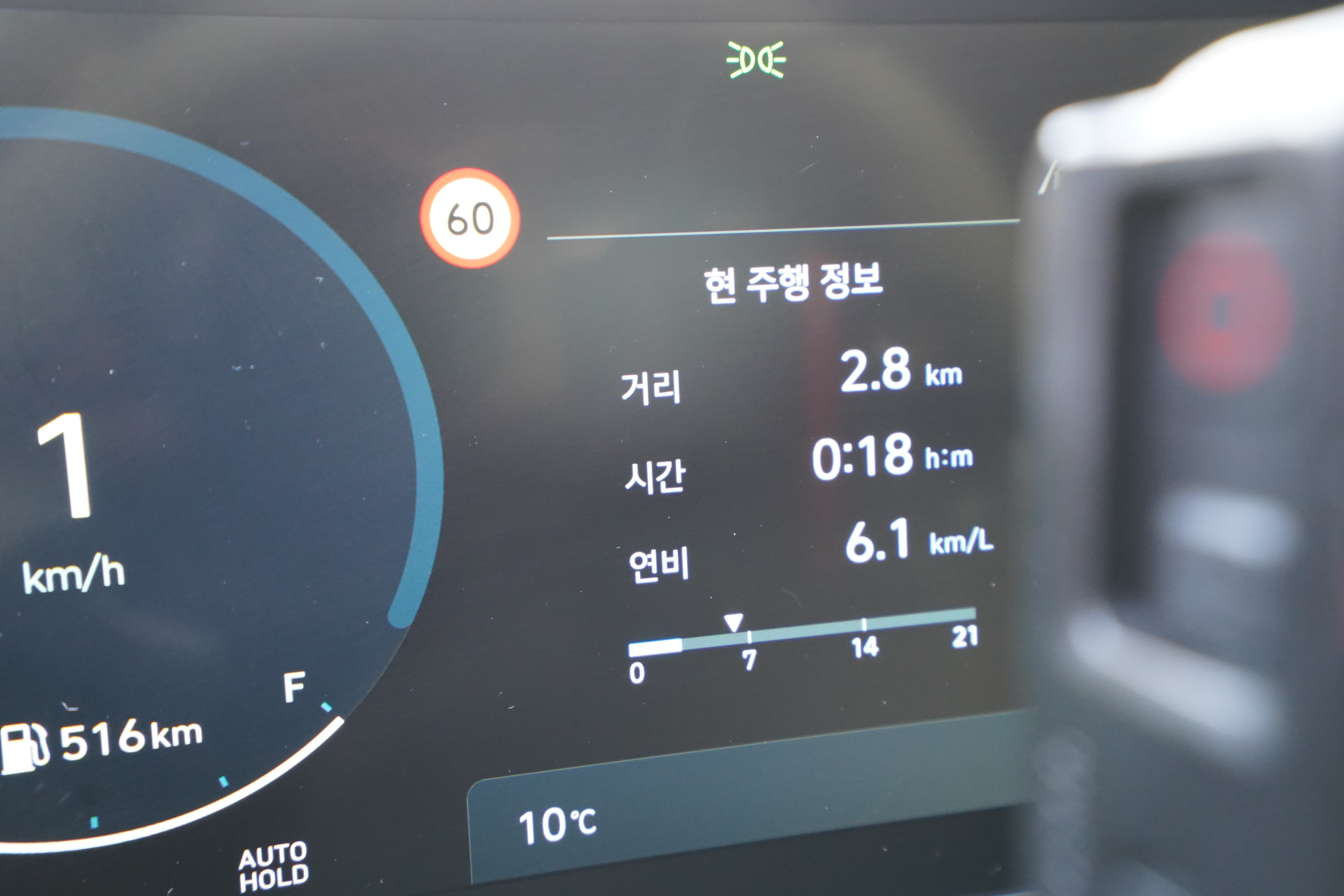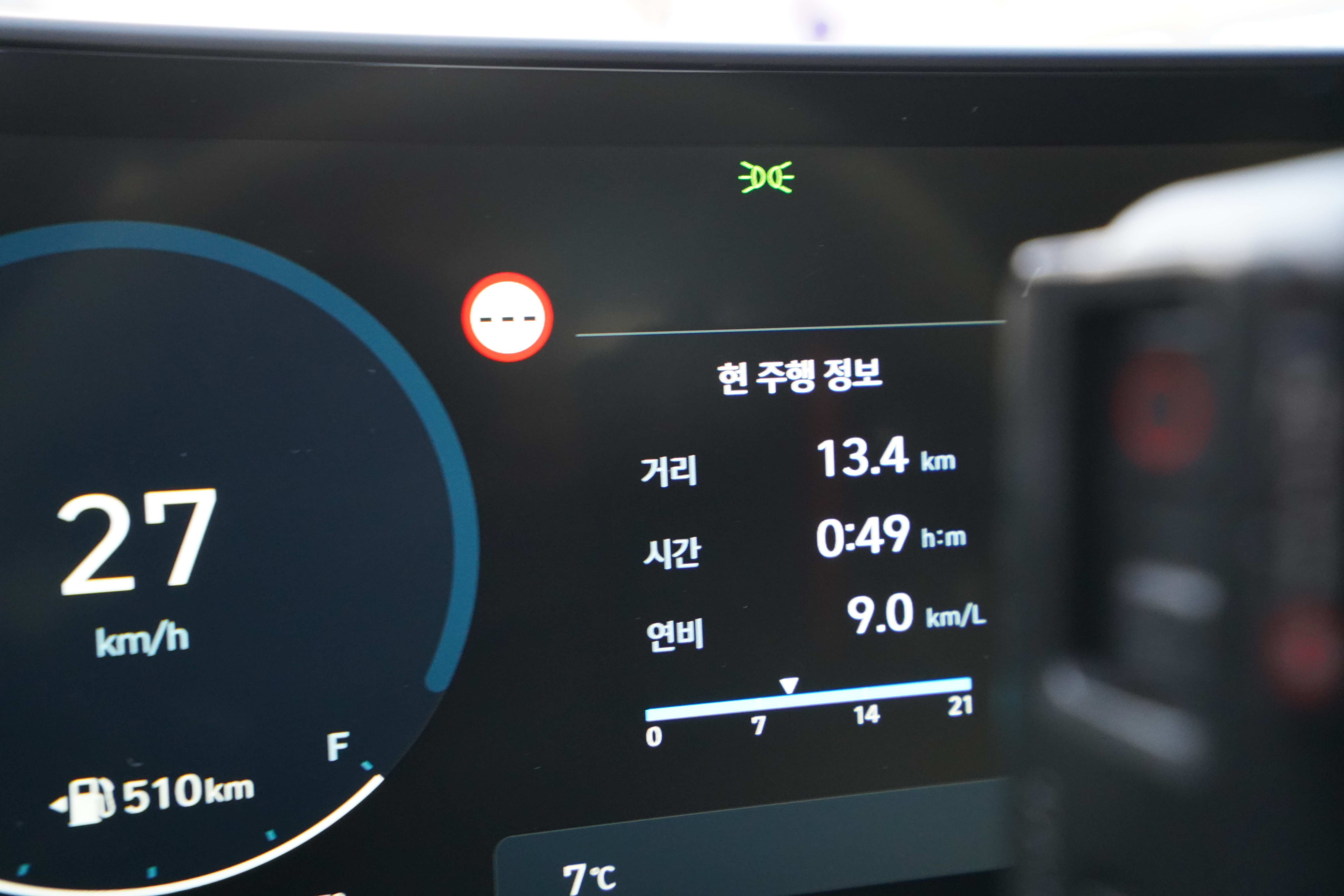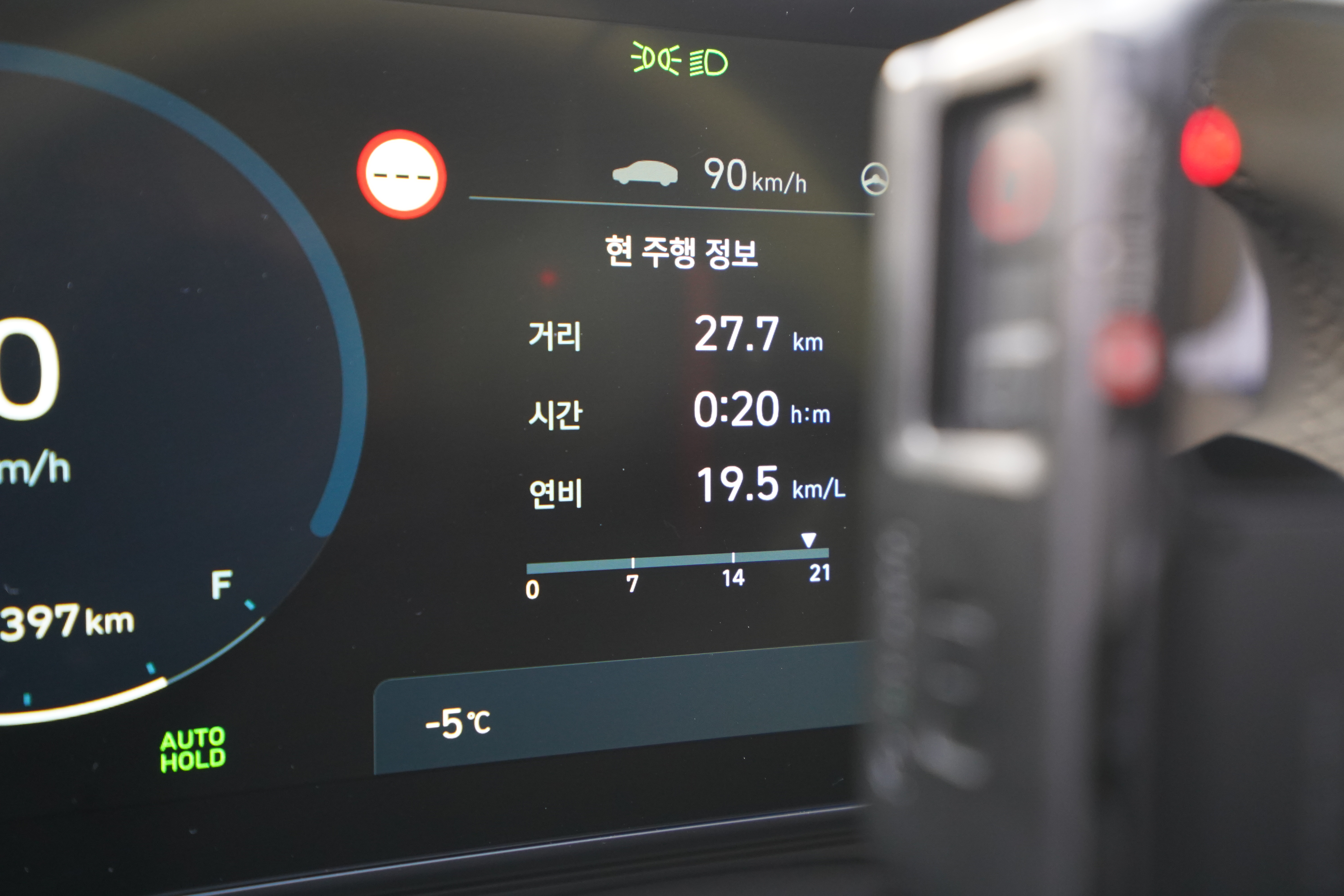 파주 출판단지에서 시속 90km/h 크루즈 컨트롤을 켜고 주행해본 결과 약 27km 주행에 20분 소요되어 연비 19.5km/L까지 보여준다는 것을 확인할 수 있었다. 사실 이 구간은 처음부터 끝까지 어댑티브 크루즈컨트롤로 시속 90km/h 로 꾸준히 달렸던 연비이기 때문에 실제 이 정도 연비까지는 보기는 힘들 수 있지만 이 차량의 최악의 연비와 최고의 연비 차이는 꽤 크다는 사실을 알 수 있다.