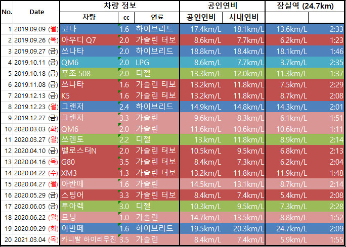 경기 광명에서 시작해서 가산디지털단지->구로디지털단지->신림->사당->방배->강남->삼성->잠실역까지 지하철 2호선 라인으로 총 24.7km를 주행하는 코스로 오후 5시에 출발해서 저녁 6시 강남에 도착하여 잠실까지 빠져나오는 연비테스트이다. 사실 대략적 평균 2시간정도 걸리는 코스로 보통 시내 연비가 이 연비보다 좋다는 것을 참고하면 되는 테스트이다.