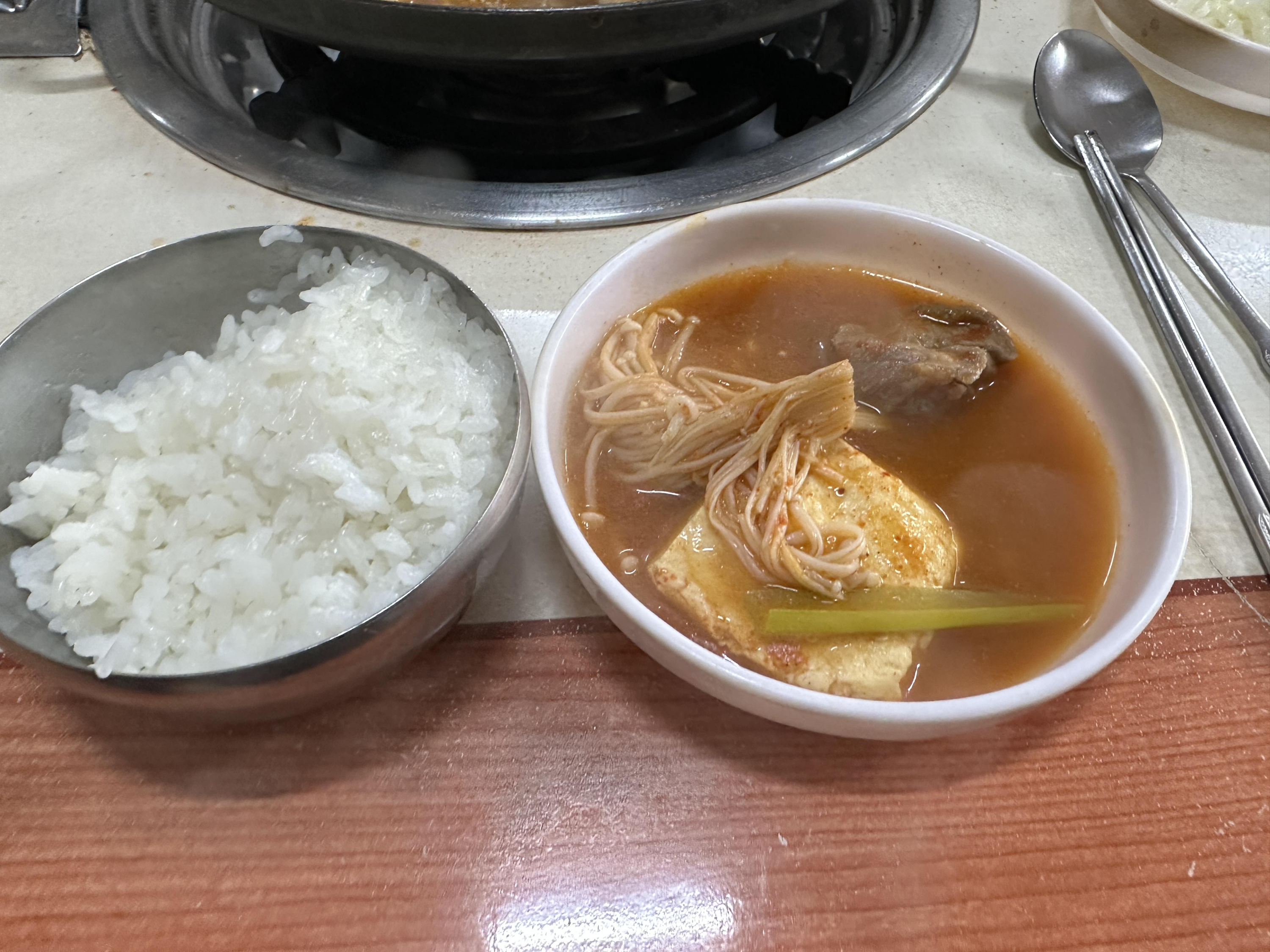 돼지고기 그리고 두부와 팽이버섯 그리고 당면과 호박 / 양파 / 파가 전부인 메뉴는 육수가 조금 특이한 것을 제외하고는 특별히 새로운 느낌은 없다. 끓는데 시간이 좀 걸리는 편이다.