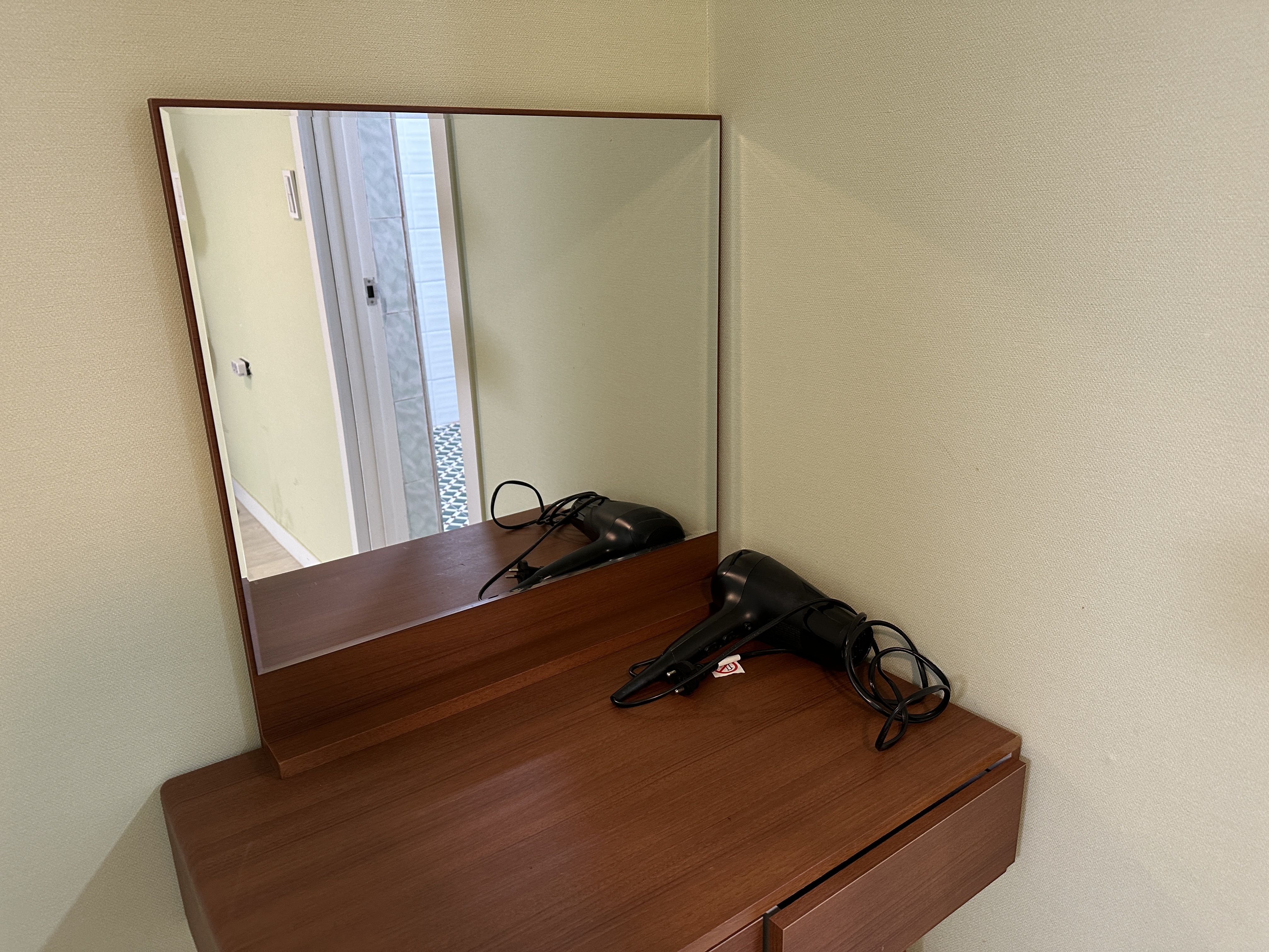안방에는 화장실이 하나 있어 샤워 시설이 1개 존재하며 화장대에는 머리를 말릴 수 있는 드라이기가 한 개 포함되어 있다.