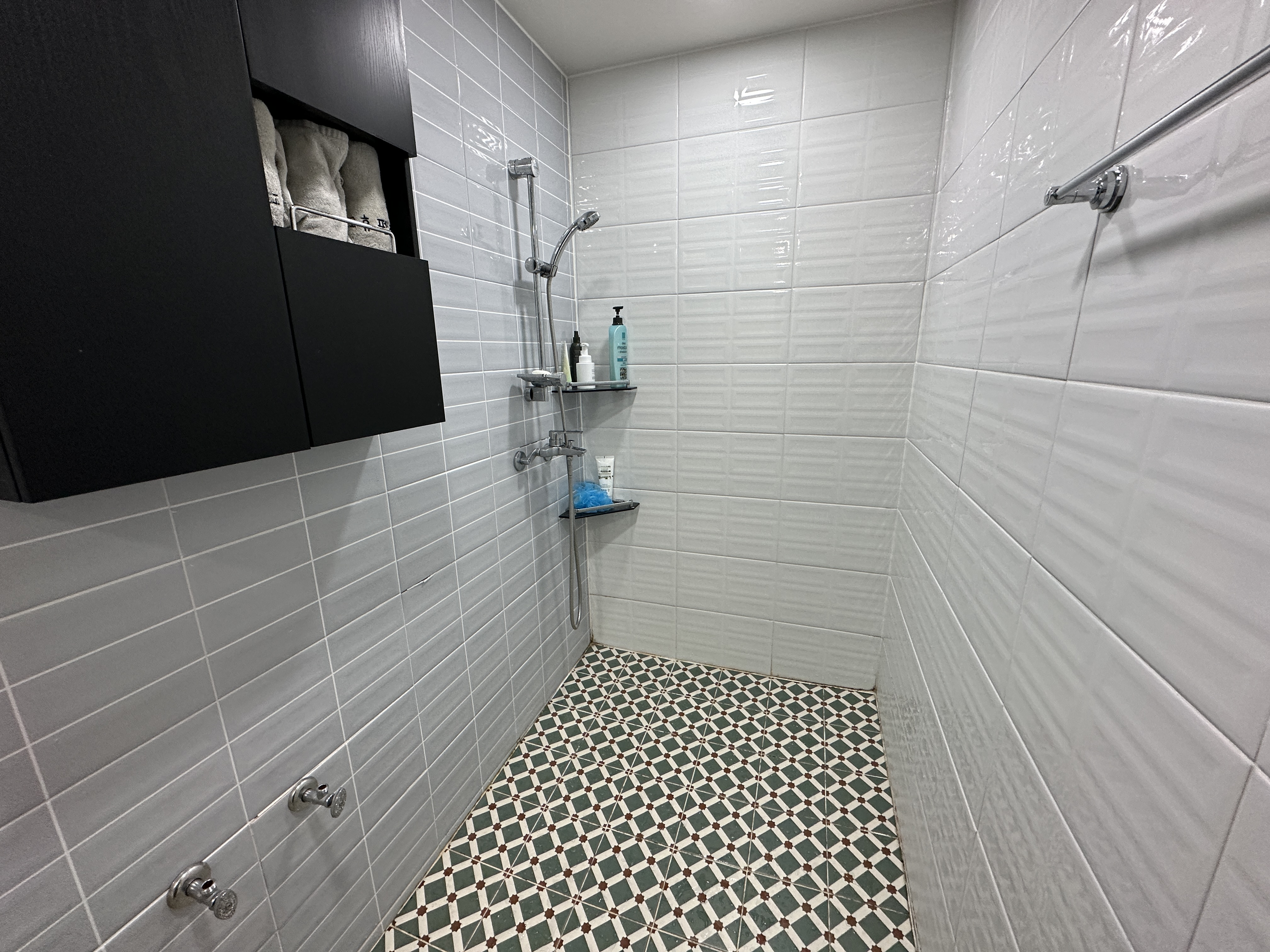 거실에 붙어 있는 화장실은 2개의 샤워시설이 적용되어 있는 욕실이 있어 총 2개의 화장실 3개의 샤워 시설이 있다.