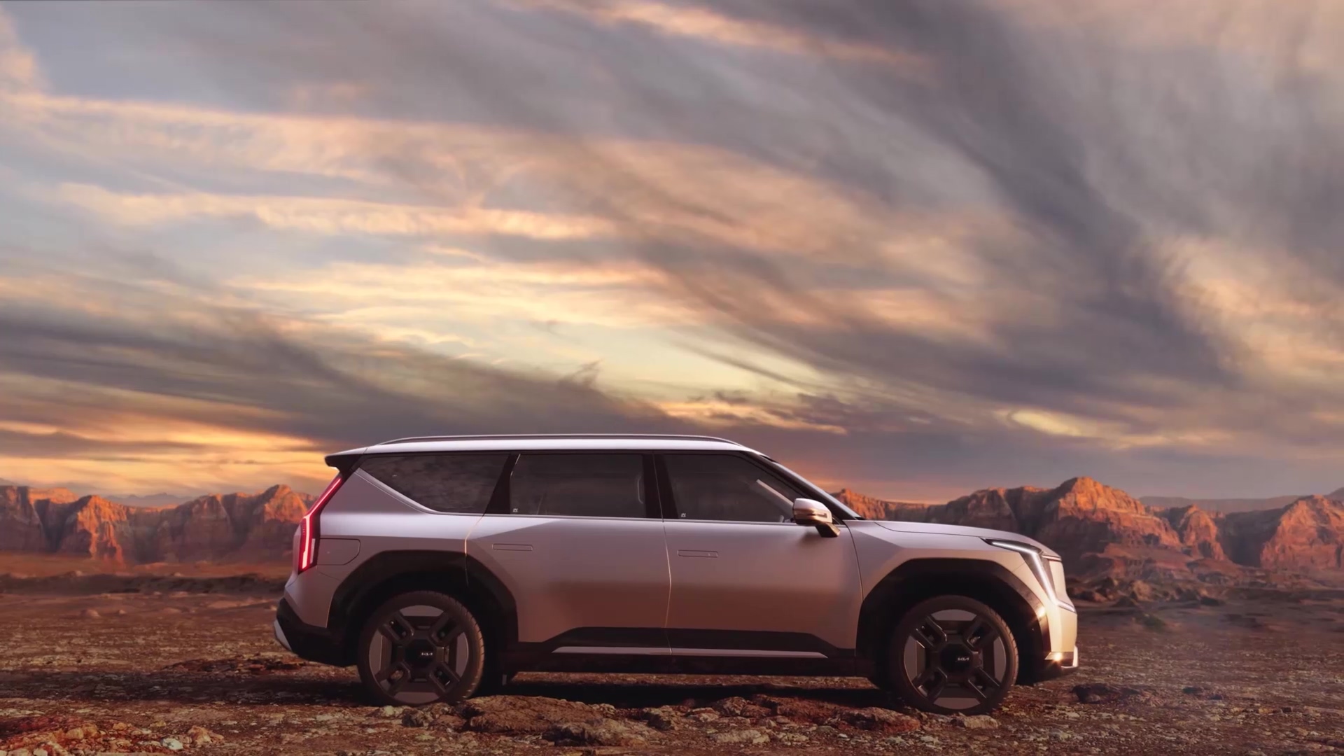 차량 측면 디자인은 지금까지 보여준 기아 SUV 디자인들의 특성을 모두 가지고 있는 다각형 디자인으로 부드러운 볼륨감이 느껴지는 차체와 단단함 그리고 고급스러움까지 동시에 담아낸 디자인을 보여준다. 뿐만 아니라 대형 SUV 모델로 3열까지 이어지는 라인과 기존에 볼 수없는 SUV 전기차의 긴 휠베이스는 실내 공간이 얼마나 넓은지 간접적으로 느낄 수 있다.