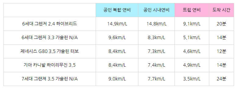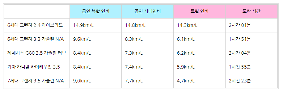 역시 하이브리드 모델은 6세대 모델이라도 꽤 괜찮은 연비를 보여줬다. 다음 번 46번째 테스트는 7세대 그랜저 하이브리드 차량을 테스트할 예정인데 굉장히 기대가 되는 부분이다. 하지만 7세대 그랜저 3.5 가솔린 자연흡기 모델은 6세대 그랜져 3.3 가솔린 모델 보다 0.9km/L 정도 차이를 보여줬으며 도착 시간이 다르지만 카니발 하이리무진과도 꽤 많은 격차를 보여줬다.