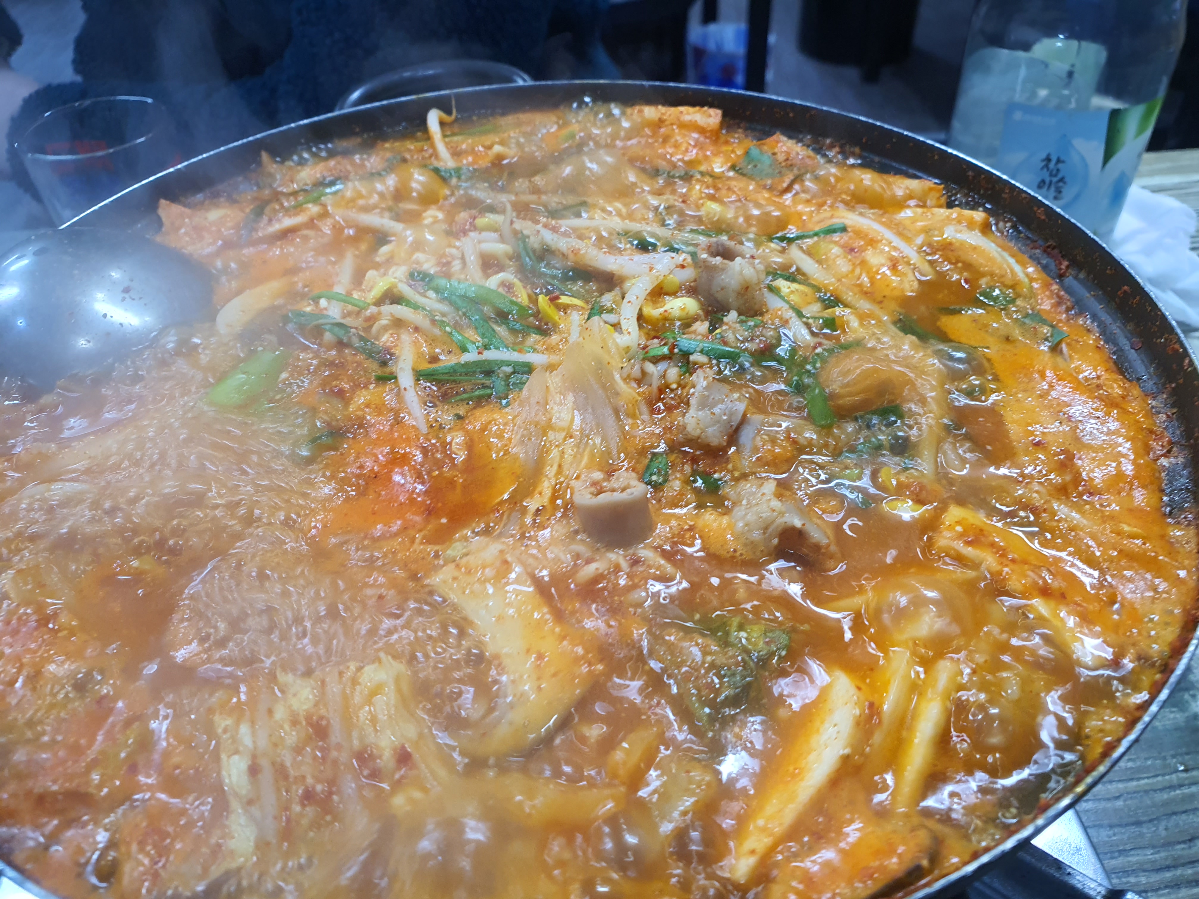 소주를 마시는데 뜨끈한 국물은 필수가 아닐까? 곱창전골도 주문을 같이 해봤다. 곱창전골은 특이하게 콩나물과 라면사리가 처음부터 들어가 왠지 부대찌개 같은 비주얼을 보여준다. 기본적으로 냄새가 꽤 좋고 구이와 전골의 조합은 말할 필요가 없었다.