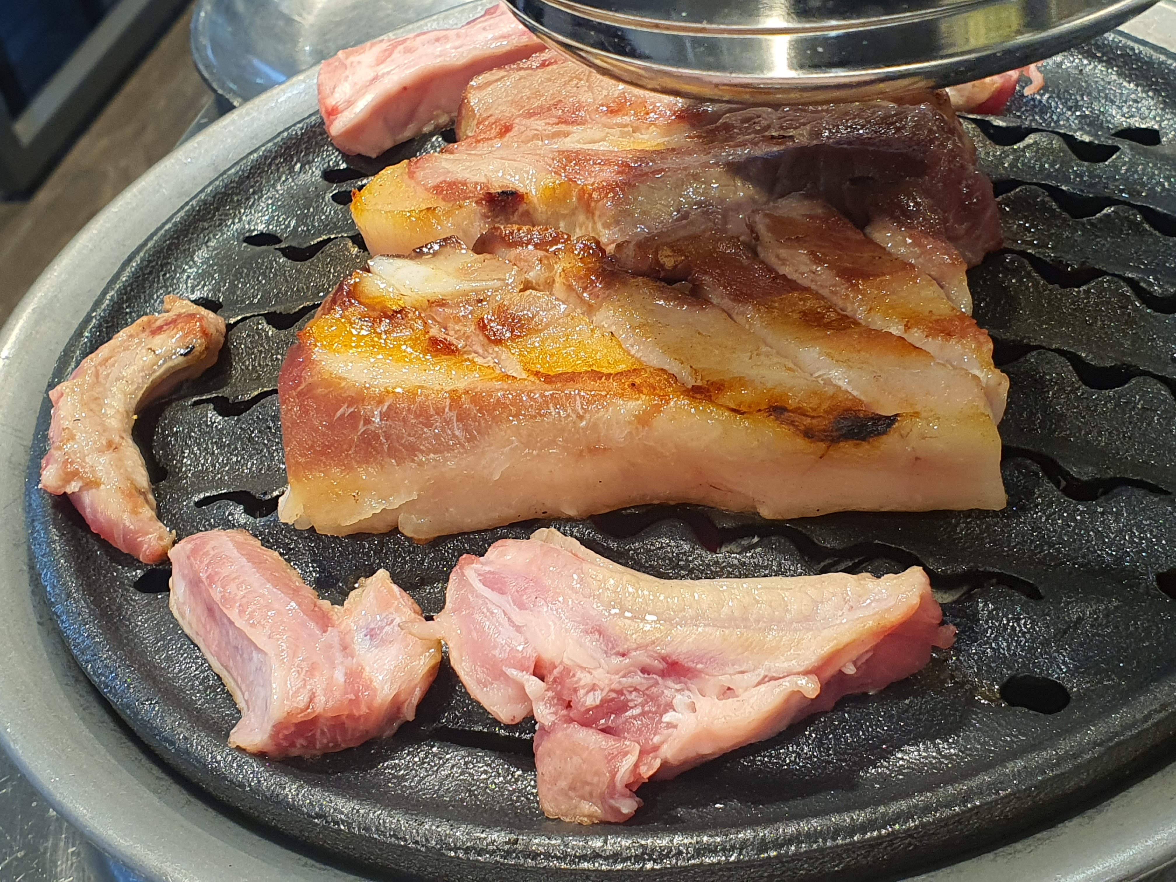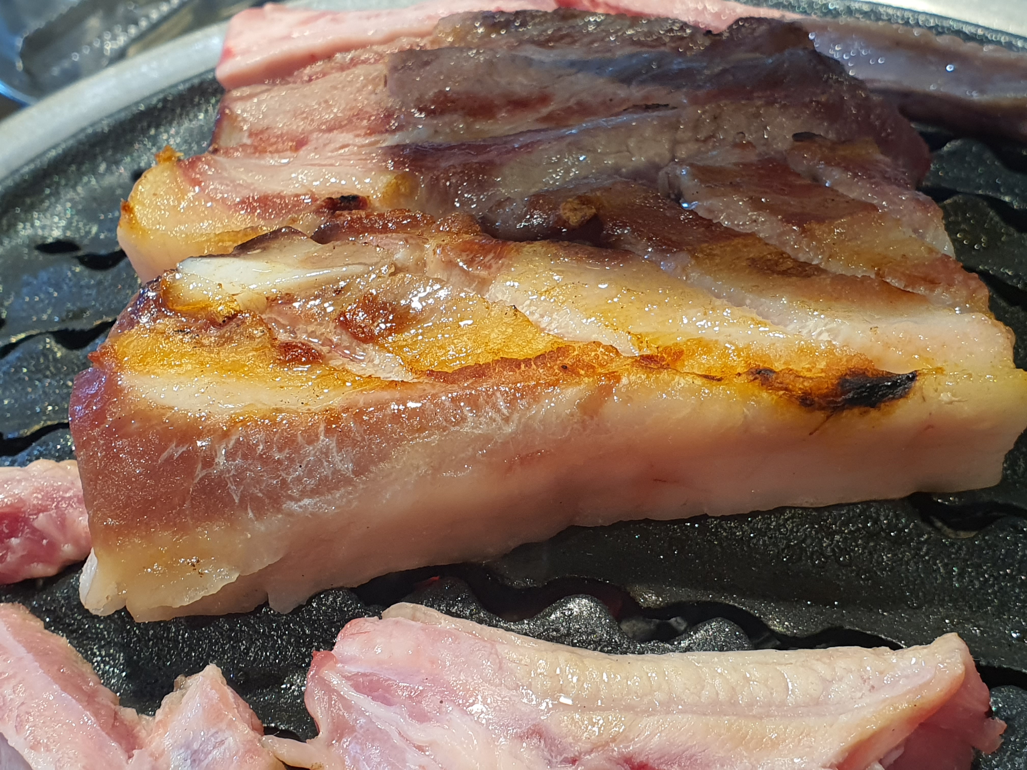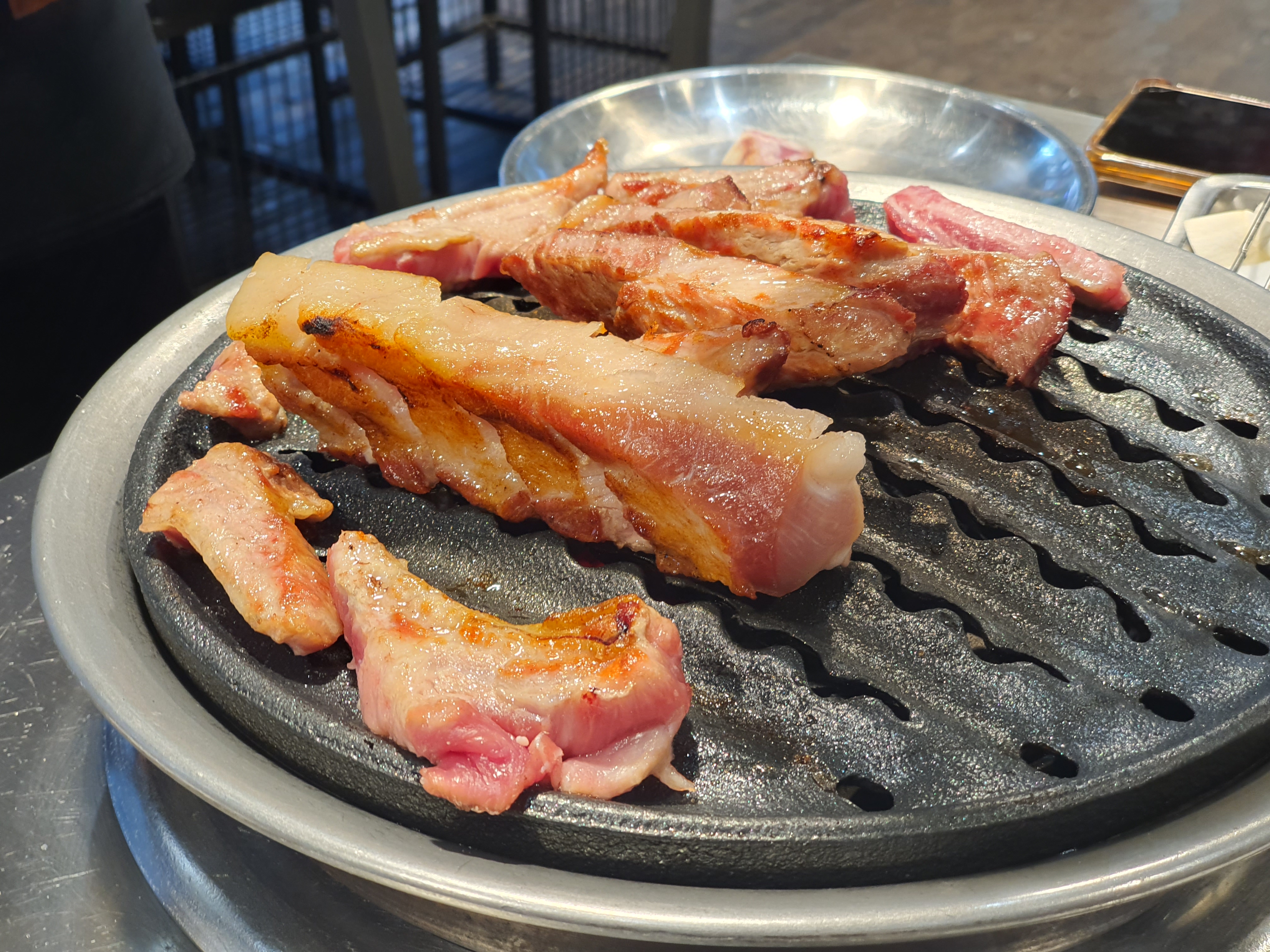 삼겹살을 뜨거울때 소금만 살짝 찍어먹어보면 겉바속촉으로 육즙이 꽤나 괜찮게 나오기에 고기 맛이 살아있은 것이 특징이다. 그냥 먹어도 좋지만 곁들임 메뉴들과 함께 먹으면 정말 맛있게 먹을 수가 있다.