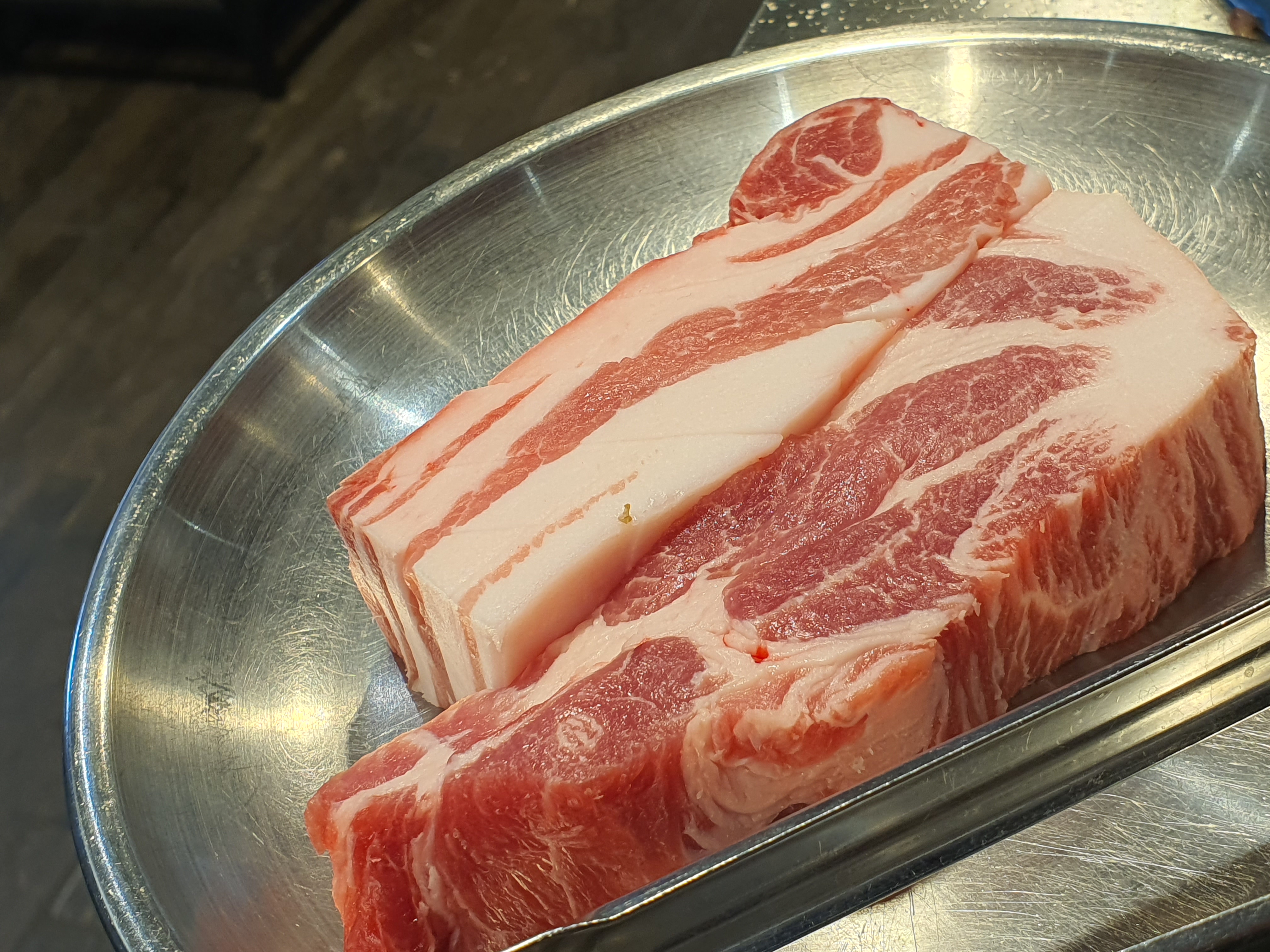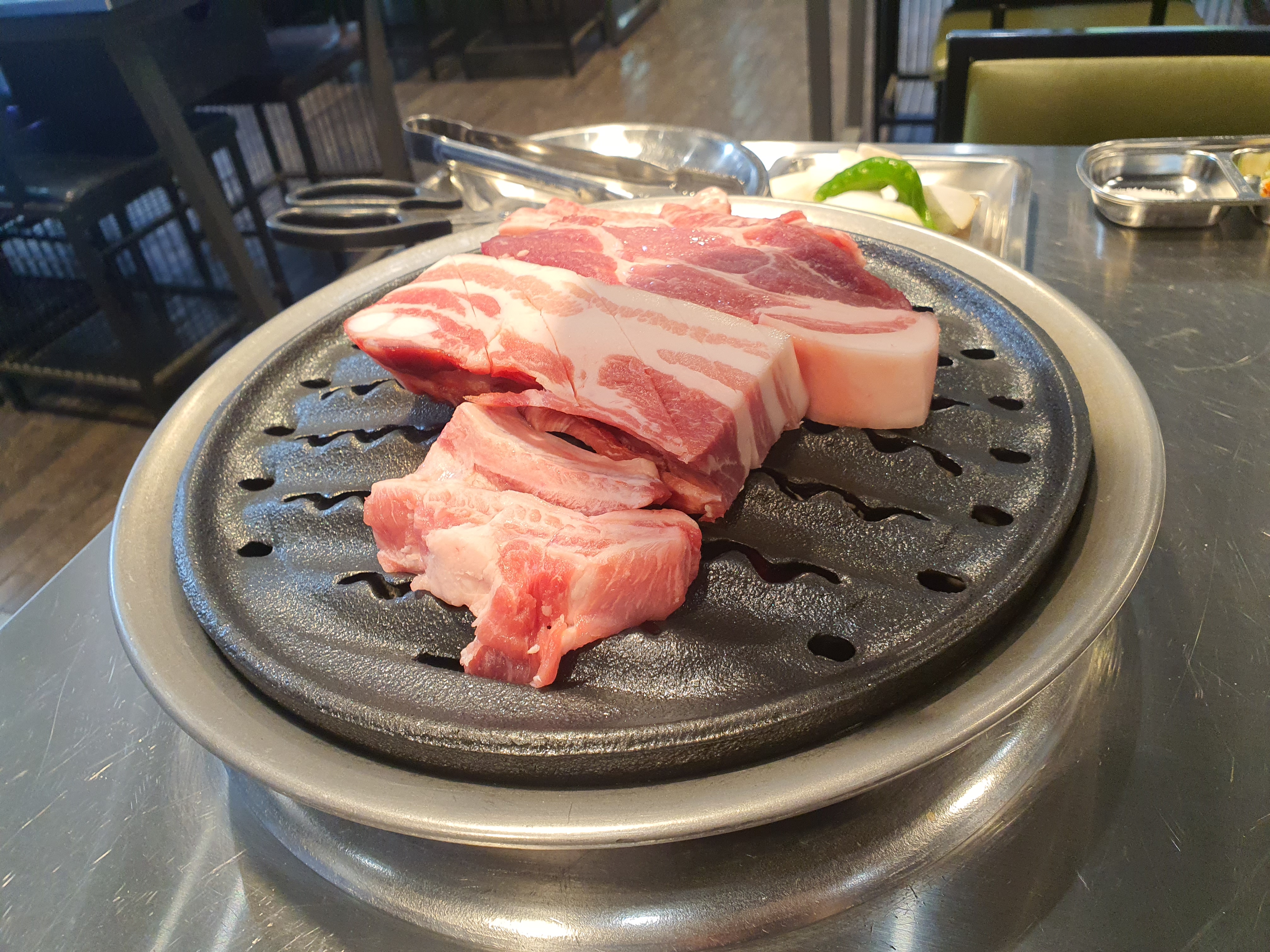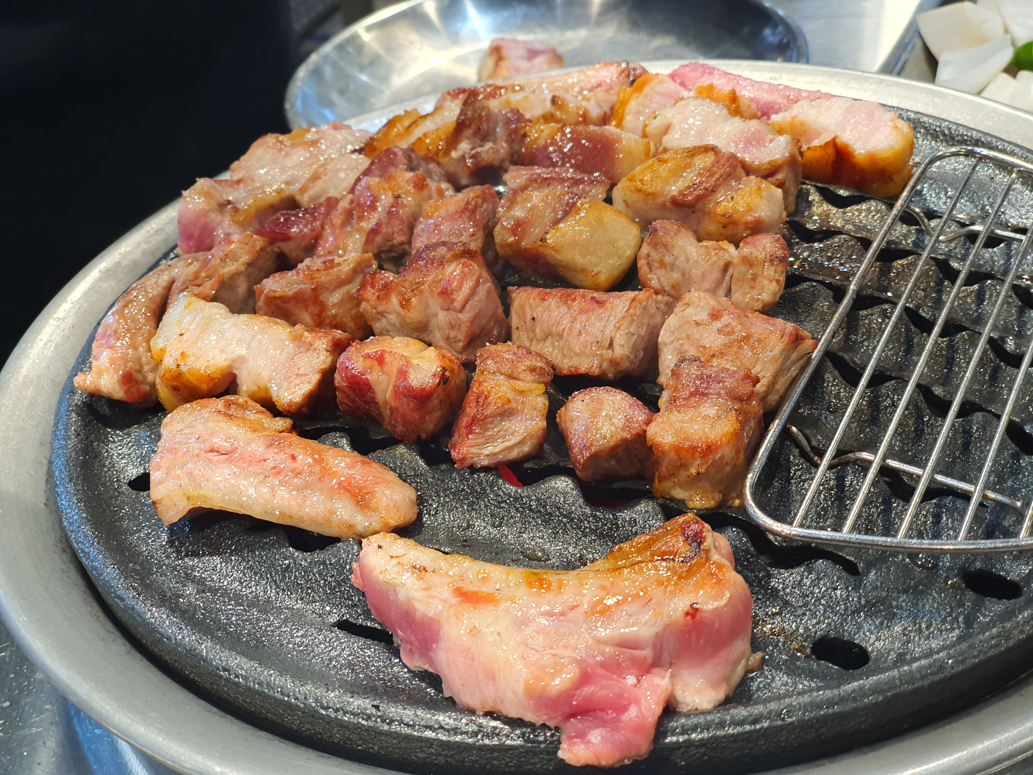 삼겹살을 뜨거울때 소금만 살짝 찍어먹어보면 겉바속촉으로 육즙이 꽤나 괜찮게 나오기에 고기 맛이 살아있은 것이 특징이다. 그냥 먹어도 좋지만 곁들임 메뉴들과 함께 먹으면 정말 맛있게 먹을 수가 있다.
