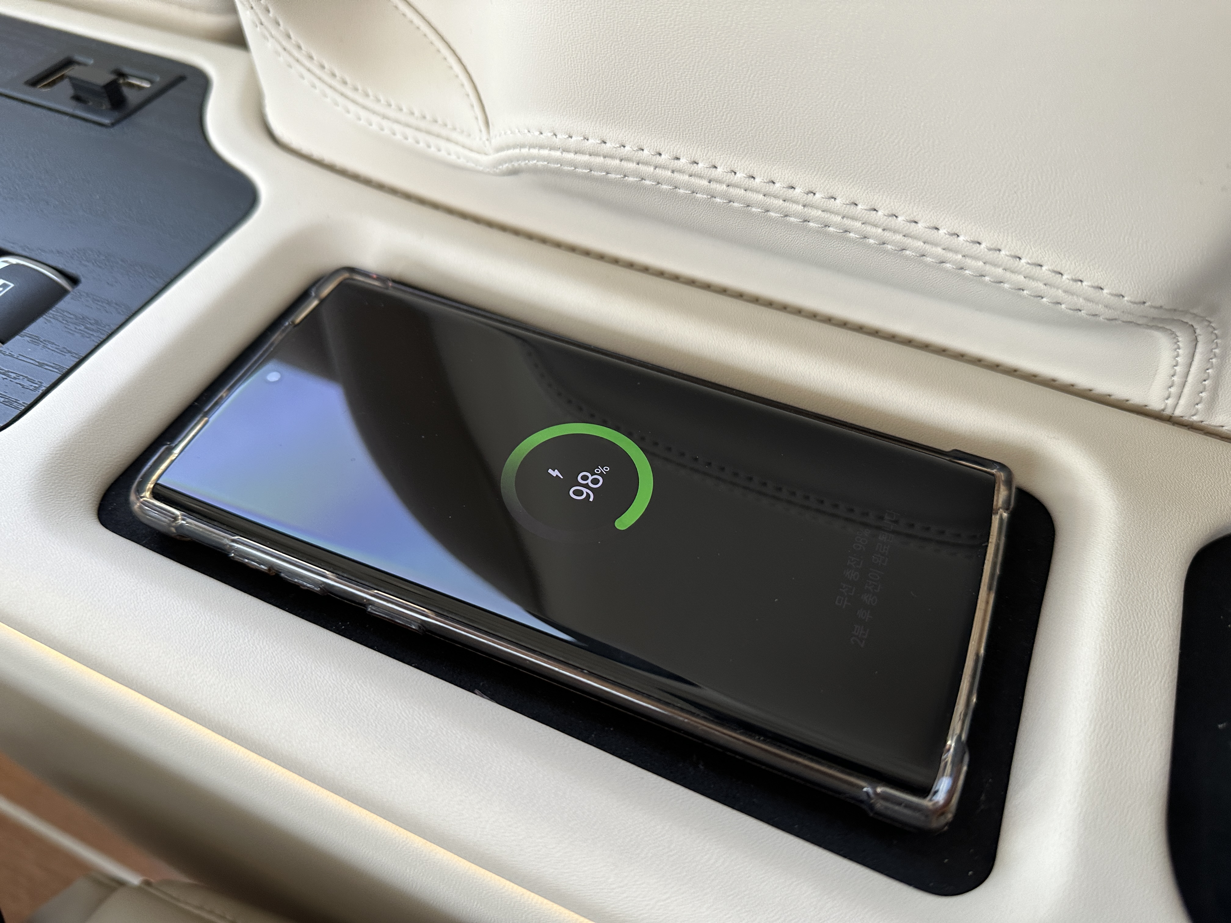하지만 컵홀더에 넣어두면 커피나 음료가 금방 차갑게 식어버리거나 혹은 얼음이 금방 녹아버린다. 하짐만 카니발 리무진 룬 시그니처4 리무진 시트에는 양쪽으로 냉/온 컵홀더가 장착되어 있어 차가운 음료는 차가움을 오랫동안 유지시켜주고 따뜻한 음료는 차갑게 식어버리는 것을 최소화시켜준다. 여기에 스마트폰 무선 충전 포트는 커다란 아이폰14 프로맥스까지 충전하고도 위 아래 공간이 남을 정도로 커다란 크기를 보여준다.