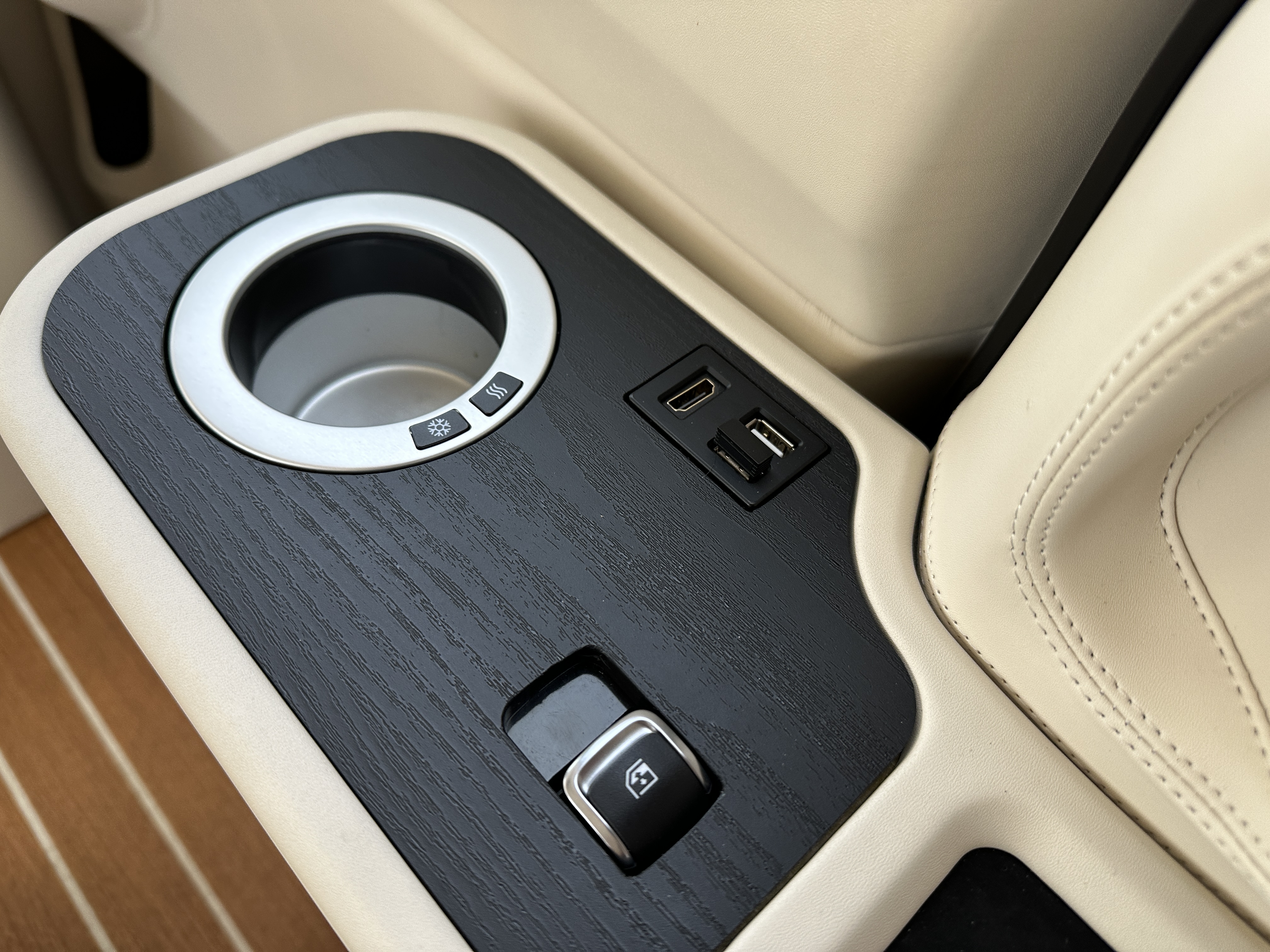 하지만 컵홀더에 넣어두면 커피나 음료가 금방 차갑게 식어버리거나 혹은 얼음이 금방 녹아버린다. 하짐만 카니발 리무진 룬 시그니처4 리무진 시트에는 양쪽으로 냉/온 컵홀더가 장착되어 있어 차가운 음료는 차가움을 오랫동안 유지시켜주고 따뜻한 음료는 차갑게 식어버리는 것을 최소화시켜준다. 여기에 스마트폰 무선 충전 포트는 커다란 아이폰14 프로맥스까지 충전하고도 위 아래 공간이 남을 정도로 커다란 크기를 보여준다.