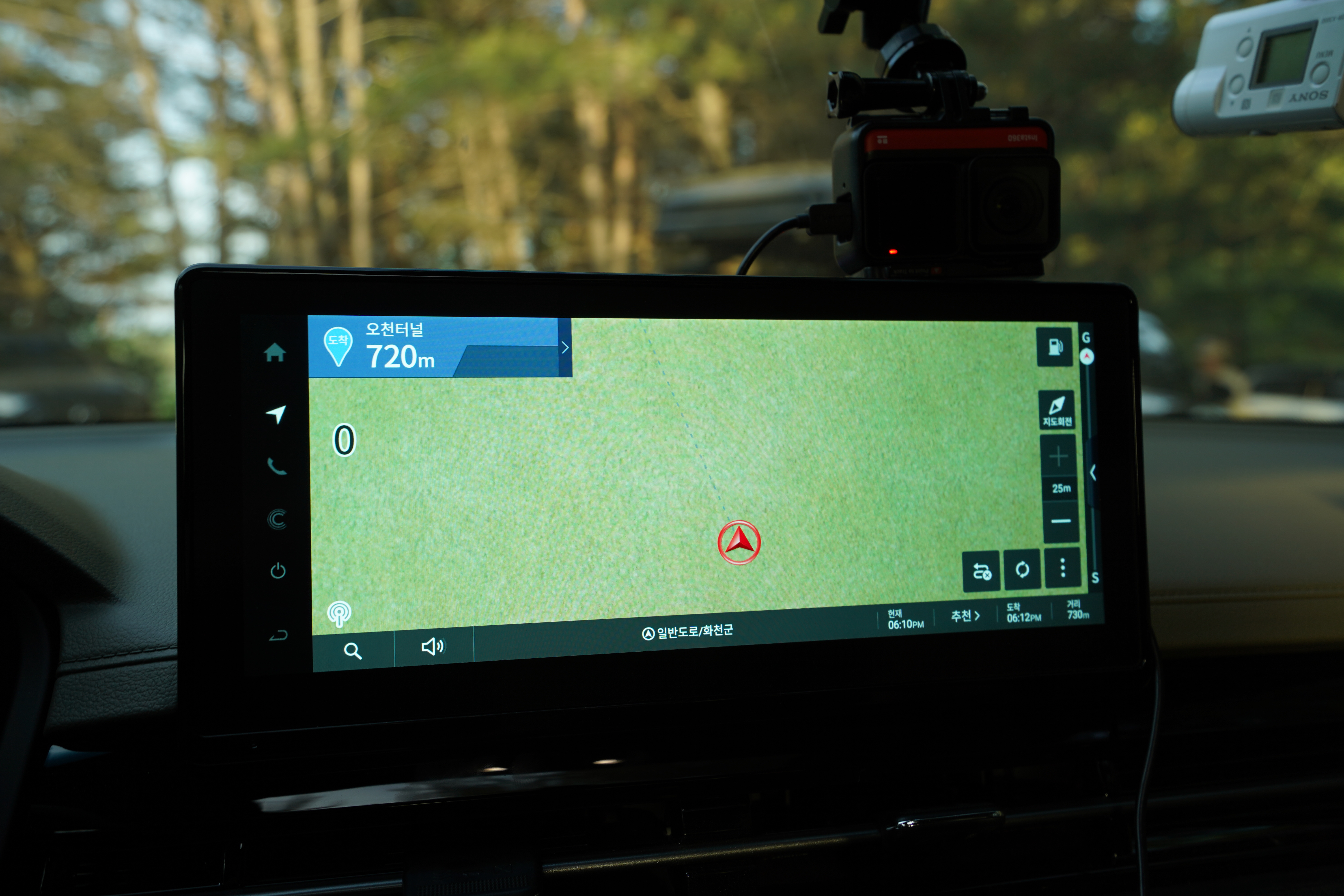 실내 디자인은 12.3인치 인포콘 내비게이션을 적용했습니다. 이전에는 9인치 인포콘 내비게이션을 적용했지만 확실히 커진 화면은 에어밴트의 위치를 하단으로 내려가 좀 더 정리된 느낌입니다. 여기에 실시간 내비게이션 업데이트와 OCR 공법을 통한 터치감과 시인성을 개선했지만 애플 카플레이 / 안드로이드 오토가 적용되지 않았다는 것이 하나에 단점으로 보입니다.