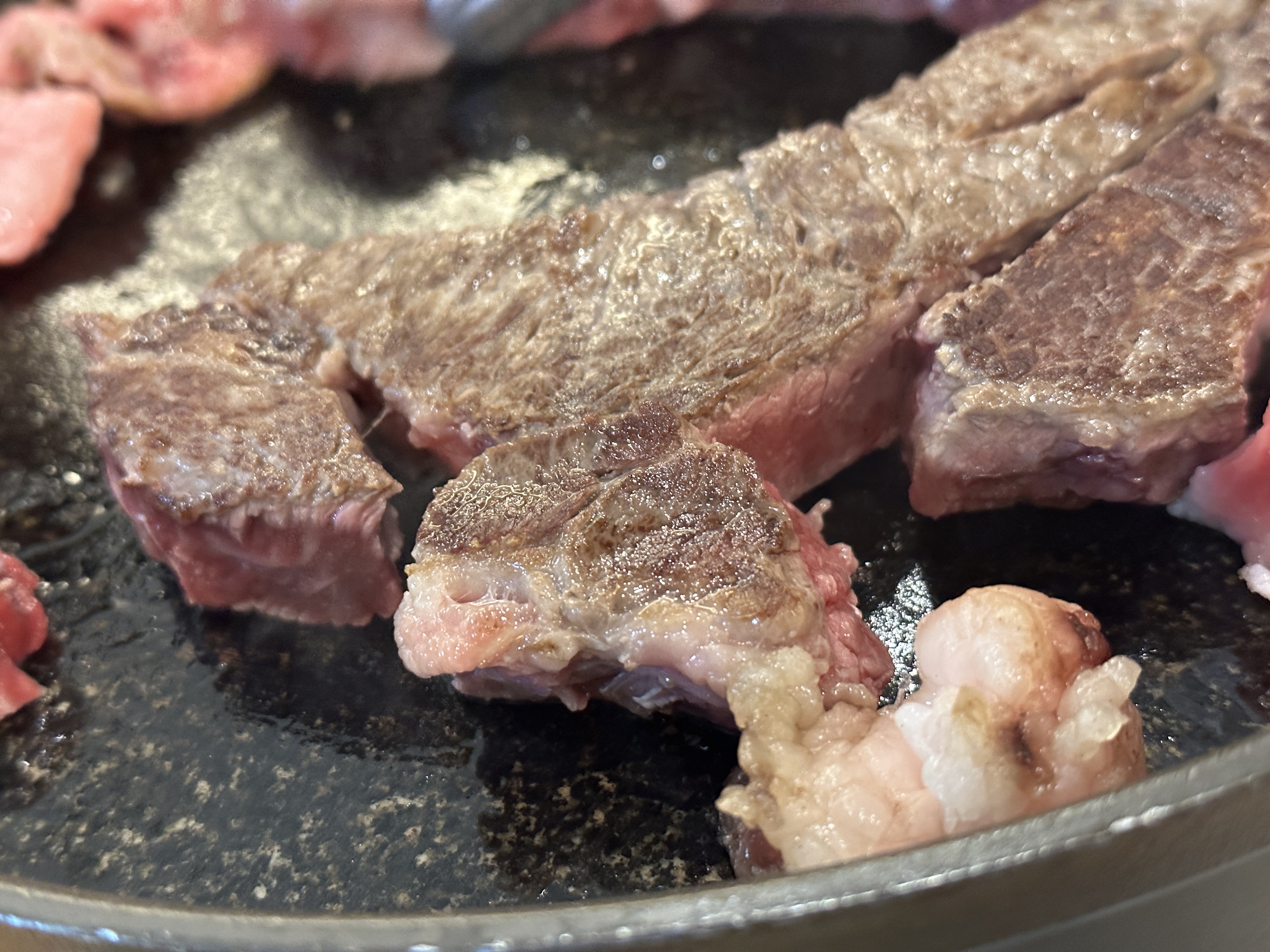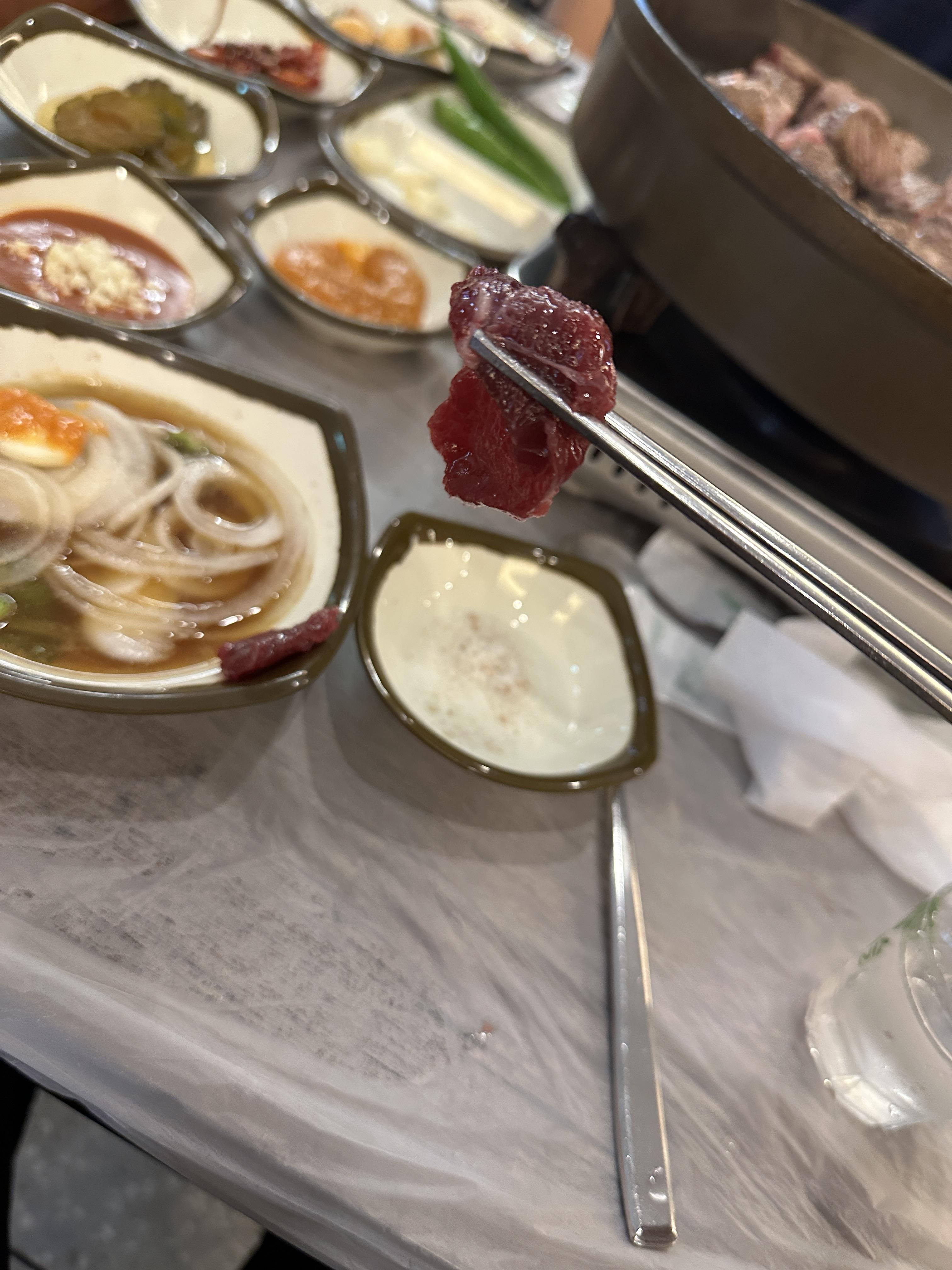 고기가 어느정도 익었다면 빨리 먹어야 한다. 사장님께서 먹기 딱 좋은 수준으로 겉은 바삭하고 속은 고기의 맛을 그대로 느낄 수 있는 형태로 익혀주시기 때문에 정말 맛이 좋은 편인데 서울에 유명 한우맛집을 다 다녀봐도 이 곳만큼 매력적이였던 곳은 많이 없었던거 같다.