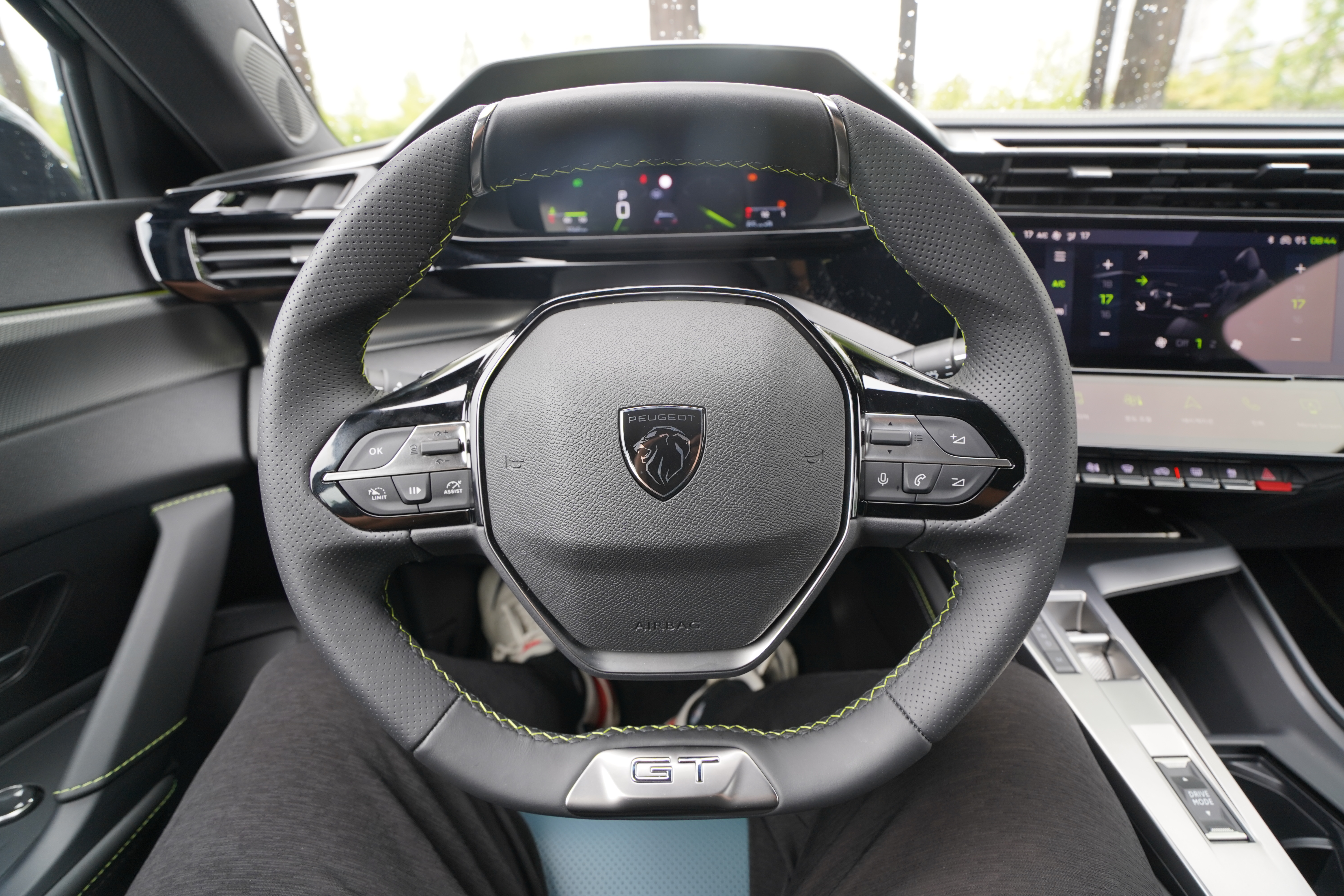 푸조 308 2세대 모델까지는 정말 이해가 불가한 인테리어 디자인을 보여줬다. 하지만 3세대 모델은 푸조 3008 / 푸조 508 이후 한 단계 더 발전된 모습으로 스티어링 휠에 브랜드 로고를 가리고 슈퍼카 브랜드 로고를 더한다면 왠지 차를 잘 모르는 사람은 믿을거 같은 수준에 상당히 미래지향적인 인테리어를 선보인다. 특히나 푸조의 i-cockpit 계기판에 맞춘 스티어링 휠은 슈퍼카에 적용될듯한 느낌의 디자인을 보여주고 주행 포지션보다 낮은 형태로 꼭 레이싱 카트의 스티어링 휠 같은 느낌을 준다. 여기까지는 푸조 508과 크게 다름이 없지만 새롭게 선보이는 인포테인먼트 시스템은 자주 사용하는 메뉴들을 하단 디스플레이 터치 버튼으로 만들어 주행 중에도 사용하기 쉽고 커다란 화면은 확실히 시인성과 편의성 그리고 사용자 UI가 꽤나 좋아졌다. 여기에 기어 변속기는 전투기에서 사용할거 같은 느낌으로 변경되어 차량에 디자인에서 아쉬운 부분은 딱히 없다.