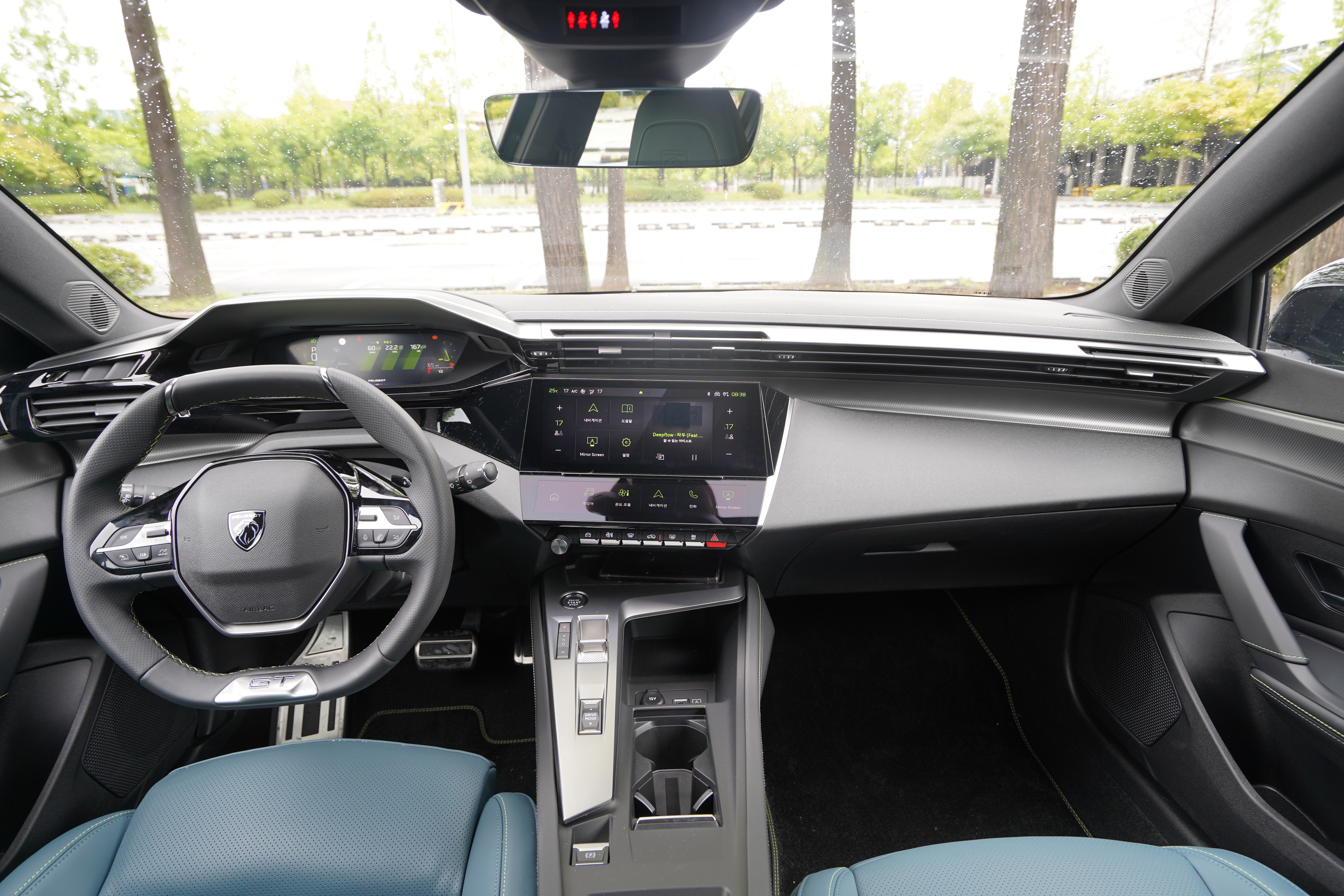 푸조 308 2세대 모델까지는 정말 이해가 불가한 인테리어 디자인을 보여줬다. 하지만 3세대 모델은 푸조 3008 / 푸조 508 이후 한 단계 더 발전된 모습으로 스티어링 휠에 브랜드 로고를 가리고 슈퍼카 브랜드 로고를 더한다면 왠지 차를 잘 모르는 사람은 믿을거 같은 수준에 상당히 미래지향적인 인테리어를 선보인다. 특히나 푸조의 i-cockpit 계기판에 맞춘 스티어링 휠은 슈퍼카에 적용될듯한 느낌의 디자인을 보여주고 주행 포지션보다 낮은 형태로 꼭 레이싱 카트의 스티어링 휠 같은 느낌을 준다. 여기까지는 푸조 508과 크게 다름이 없지만 새롭게 선보이는 인포테인먼트 시스템은 자주 사용하는 메뉴들을 하단 디스플레이 터치 버튼으로 만들어 주행 중에도 사용하기 쉽고 커다란 화면은 확실히 시인성과 편의성 그리고 사용자 UI가 꽤나 좋아졌다. 여기에 기어 변속기는 전투기에서 사용할거 같은 느낌으로 변경되어 차량에 디자인에서 아쉬운 부분은 딱히 없다.