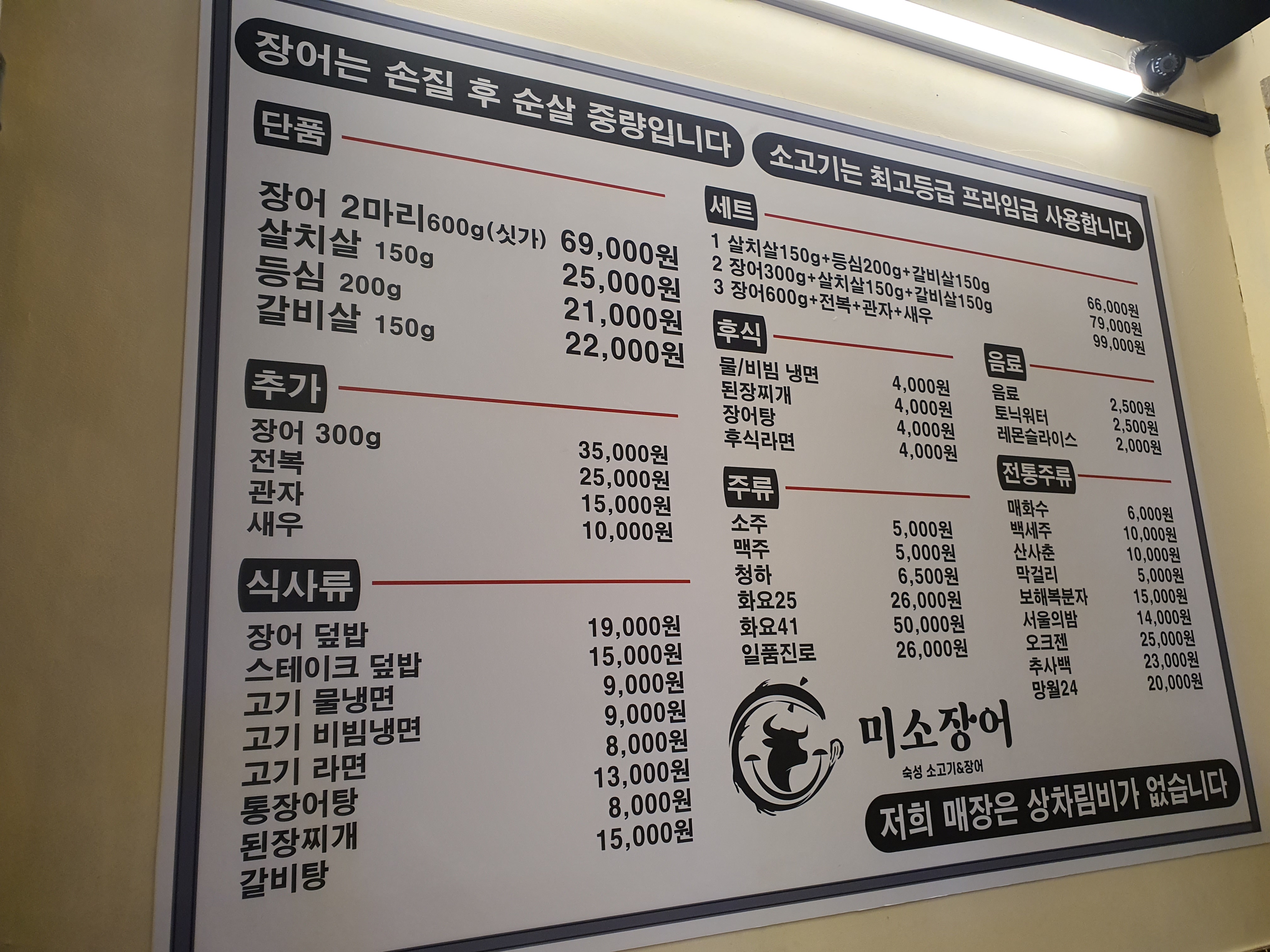 구로디지털단지역 장어맛집인 미소 장어는 기본 장어 2마리 600g 기준으로 69,000원의 가격에 판매된다. 살치살과 등심 그리고 갈비살을 판매하고 있는대 대부분 세트 메뉴로 장어와 살치살 그리고 갈비살을 위주로 시키는 편이고 소고기가 싫다면 장어와 전복 그리고 관자와 새우를 먹을 수있는 해산물 세트로 먹으면 된다. 여기에 식사류로 장어 덮밥과 스테이크 덮밥 그리고 고기 물냉면과 비빔냉면 라면 / 통장어탕 갈비탕 등 다양한 메뉴를 맛볼 수 있다.