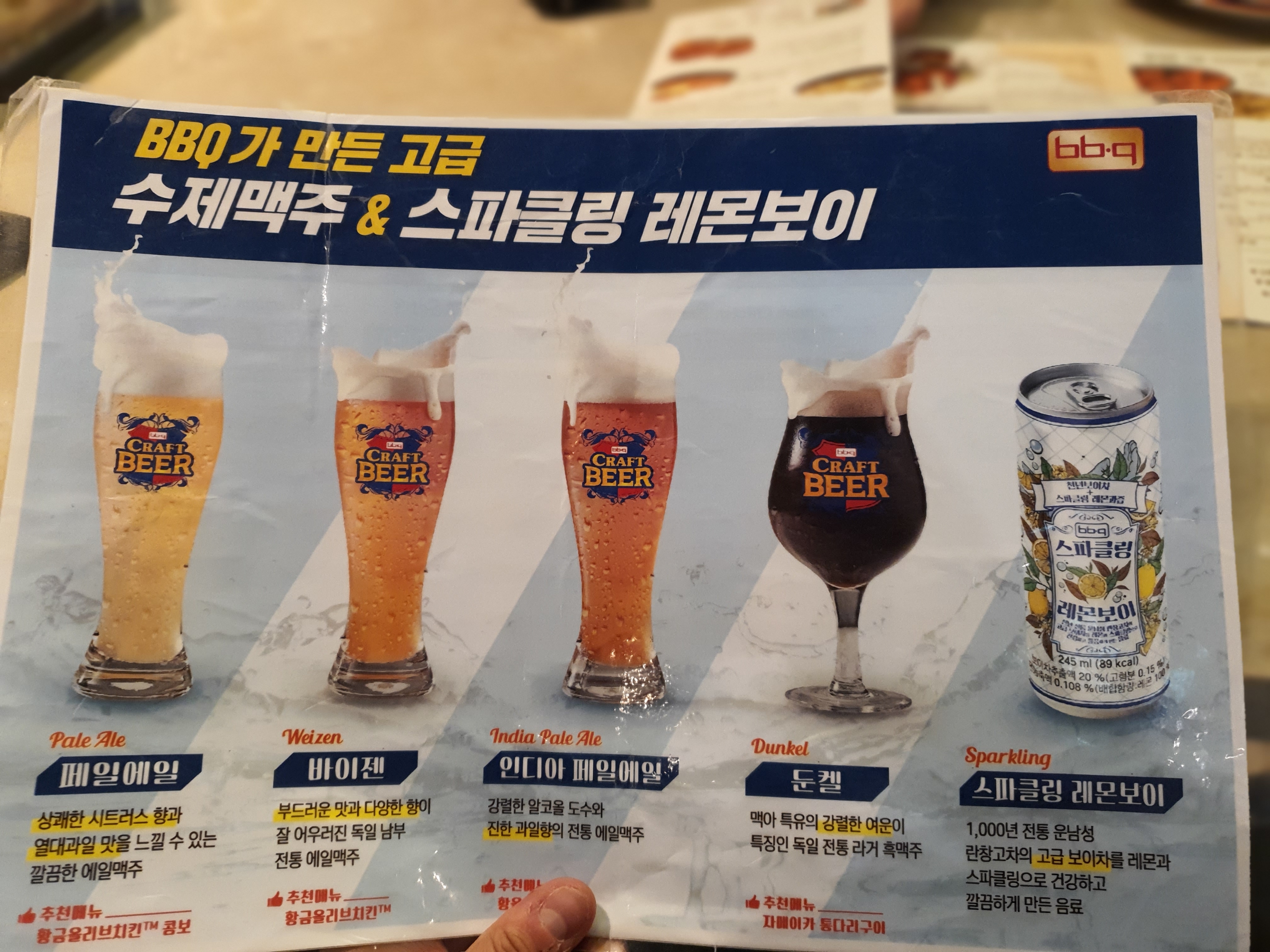 맥주 또한 페일에일 / 바이젠 / 인디아 페일에일 / 둔켈까지 다양한 생맥주를 선보이는데 BBQ가 만든 수제 맥주로 맛이 궁금하기도 했다. 흡사 치킨이 맛있는 펍에 느낌이 강하게 들기도 했다. 이미 1차를 다녀왔기에 많은 술을 마시지 않겠지만 그래도 다양한 맥주를 마셔보고 싶었다.