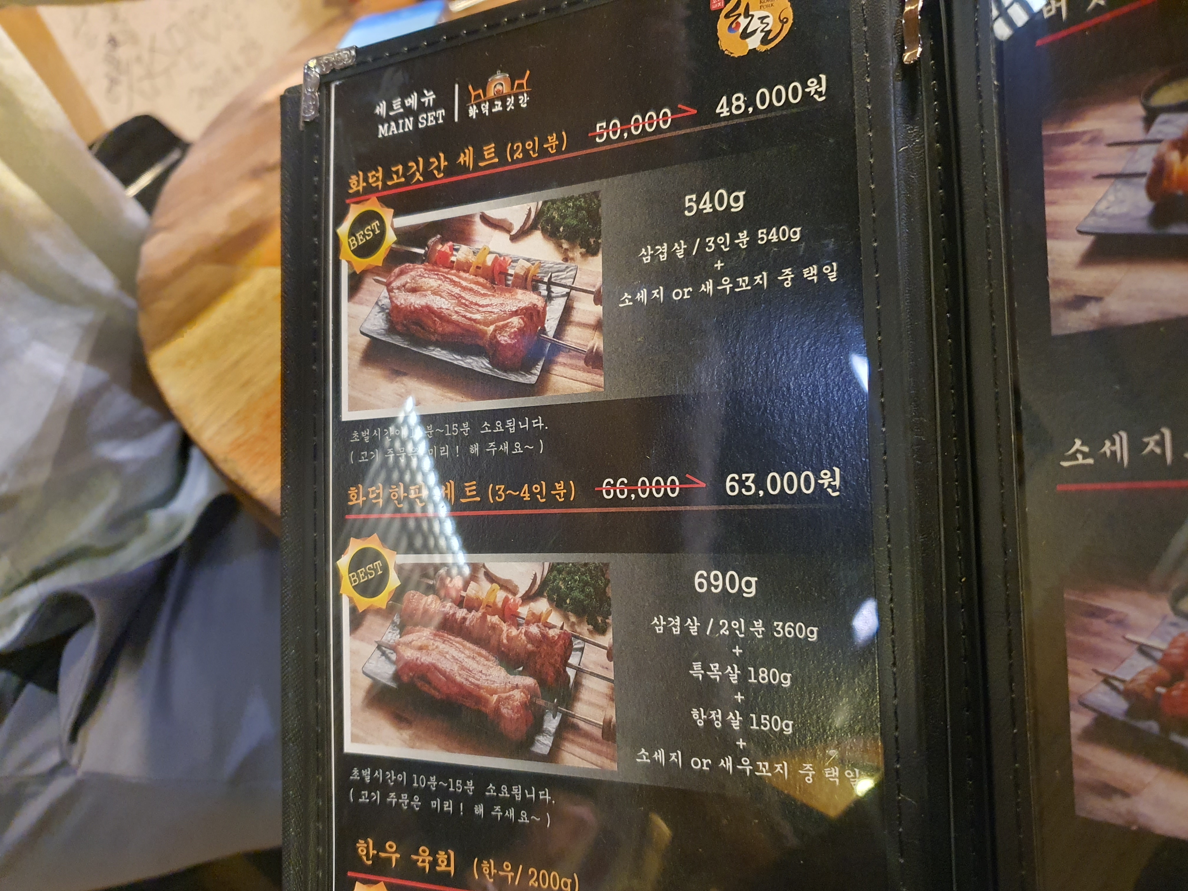일단 가격은 다른 고깃집과 큰 차이가 없는 가격대를 가지고 있다. 새트 메뉴로 화덕고깃간 새트를 먹으면 2인분 기준으로 48,000원에 삼겹살 3인분 그리고 쏘세지와 새우꼬지 중 하나를 택일할 수 있어 2인 기준 대식가가 아니라면 고기를 추가하지 않아도 될정도로 풍족한 양을 보여준다.