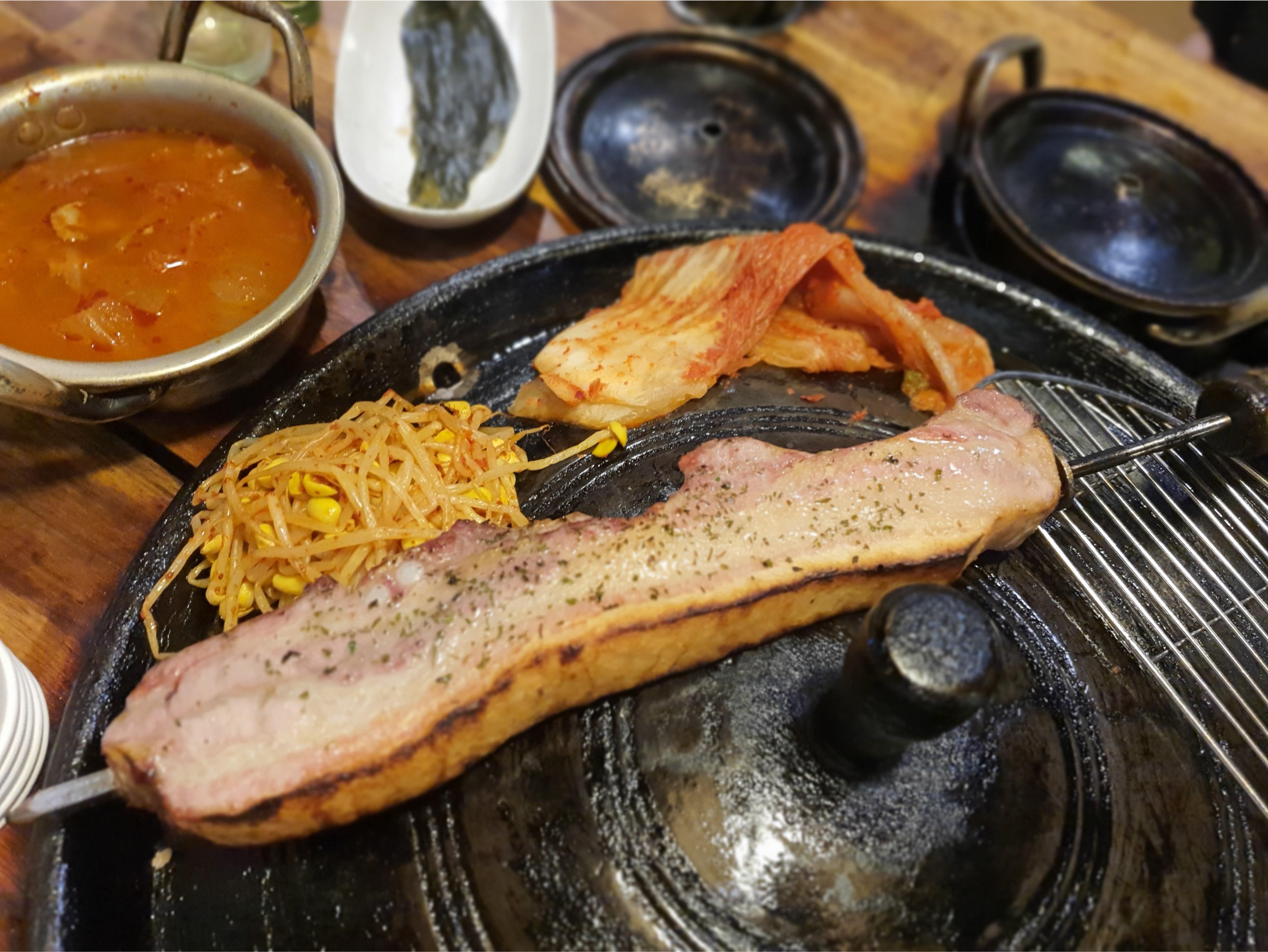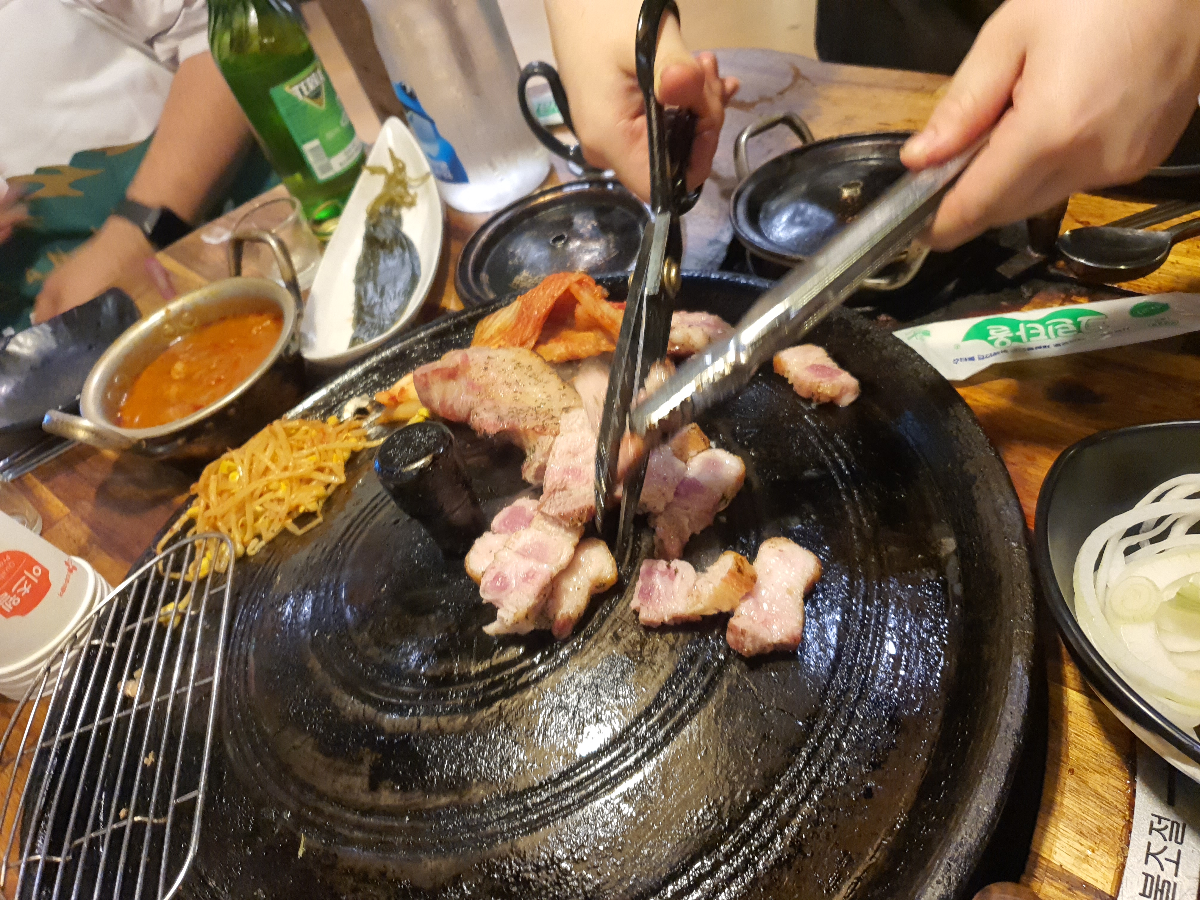 기름기가 어느정도 빠진 삼겹살은 확실히 우리집 주변에서 먹던 삼겹살과 다른 느낌을 준다. 이렇게 솥뚜껑 위에서 한 번 더 익혀주고 잘라주면 맛있는 삼겹살이 완성된다. 솥뚜껑에 장점을 잘 살려서 콩나물과 김치까지 익혀서 같이 먹으면 금상첨화이다.