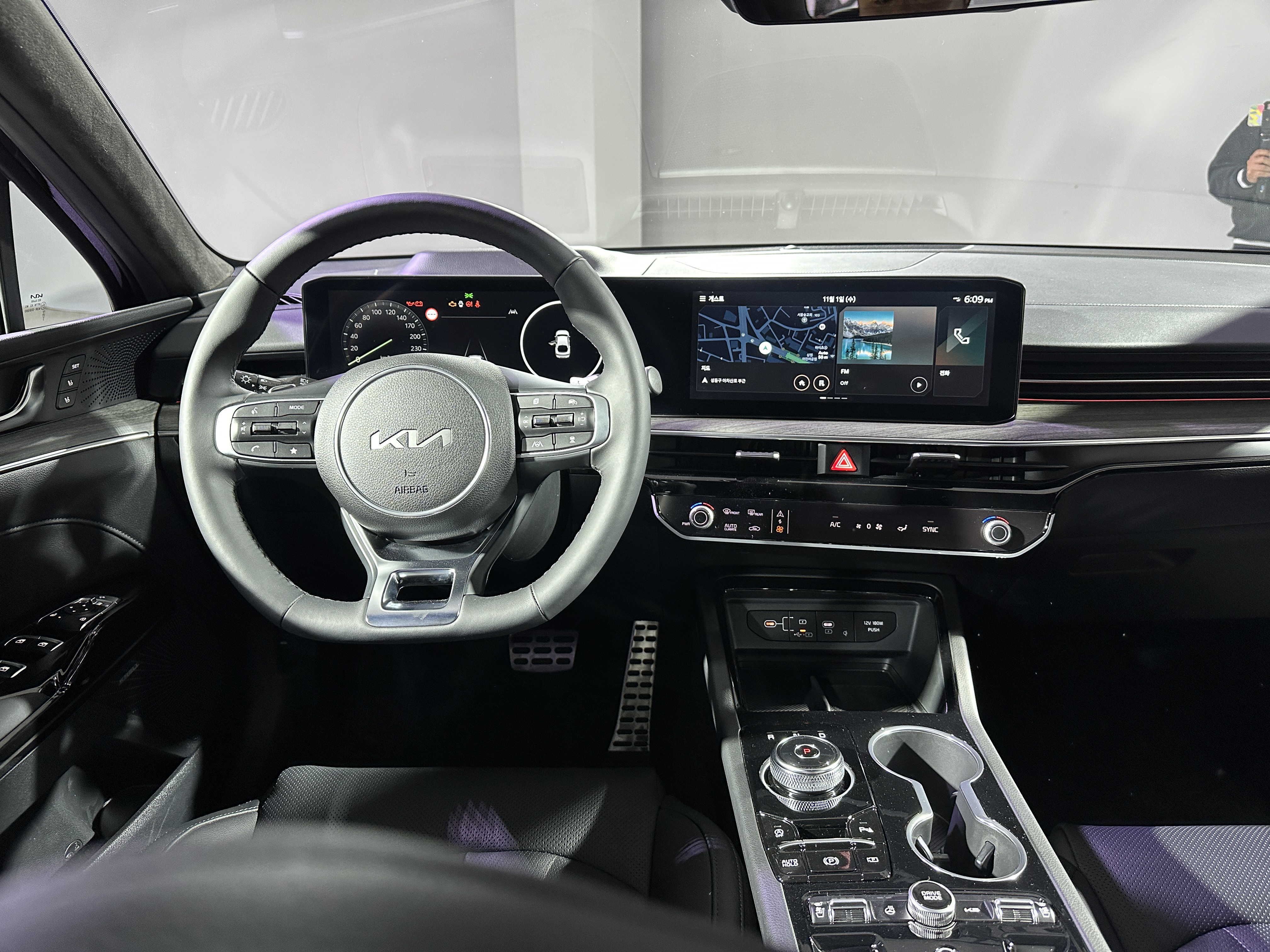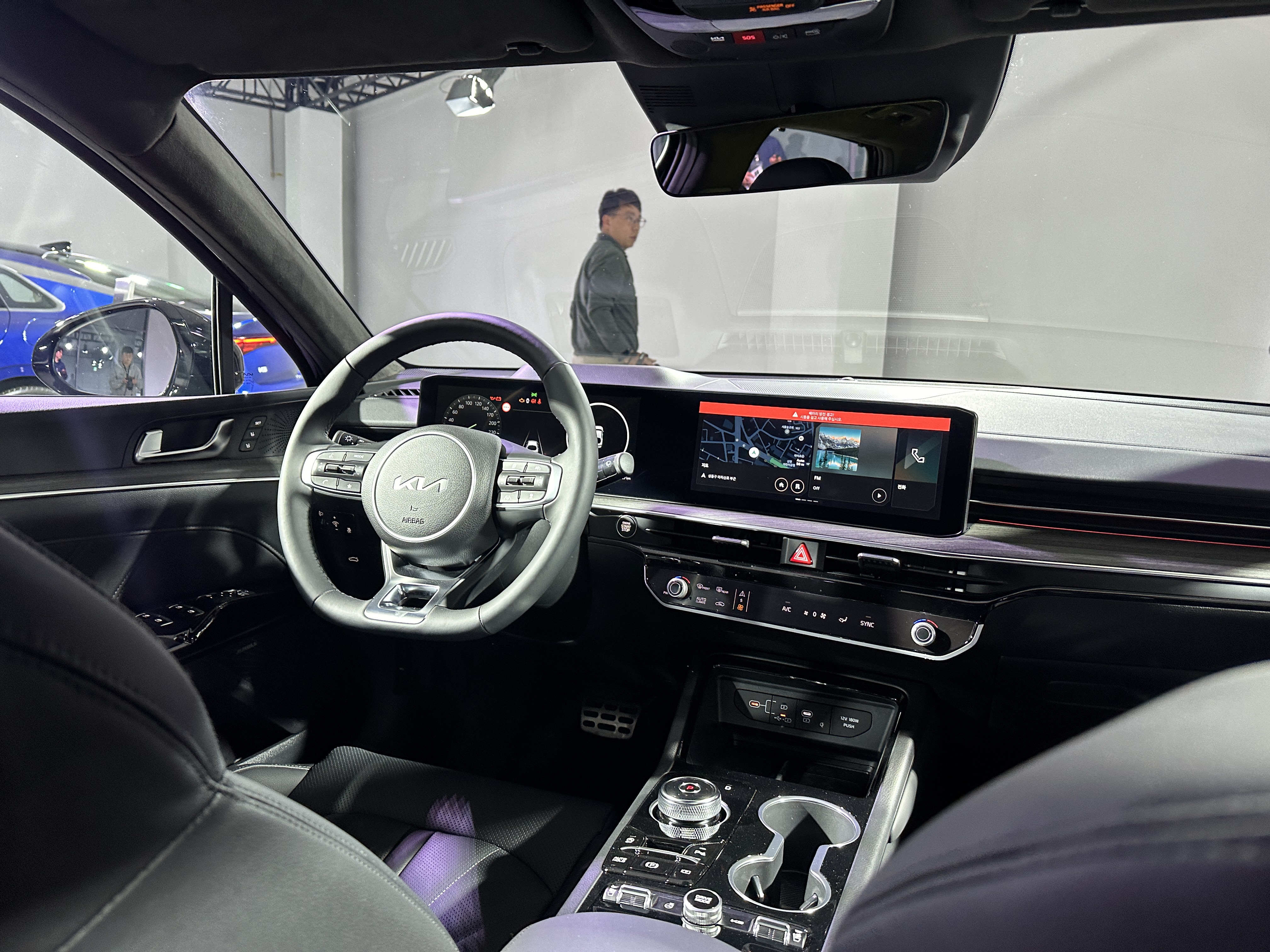 파노라믹 커브드 디스플레이로 보다 넓어진 실내를 보여주며 K5에 버턴 구성을 최적화하여 인포테인먼트 시스템과
