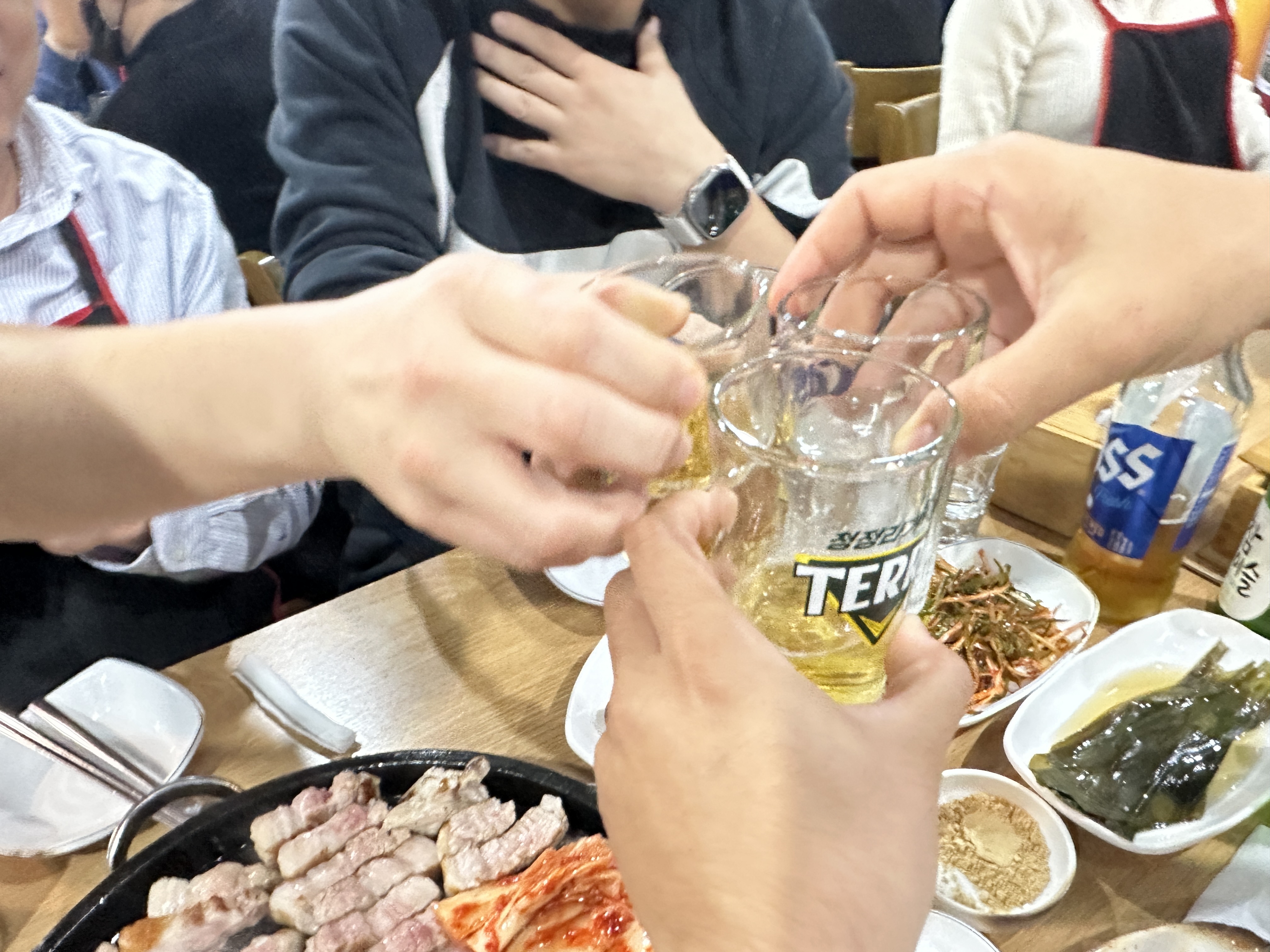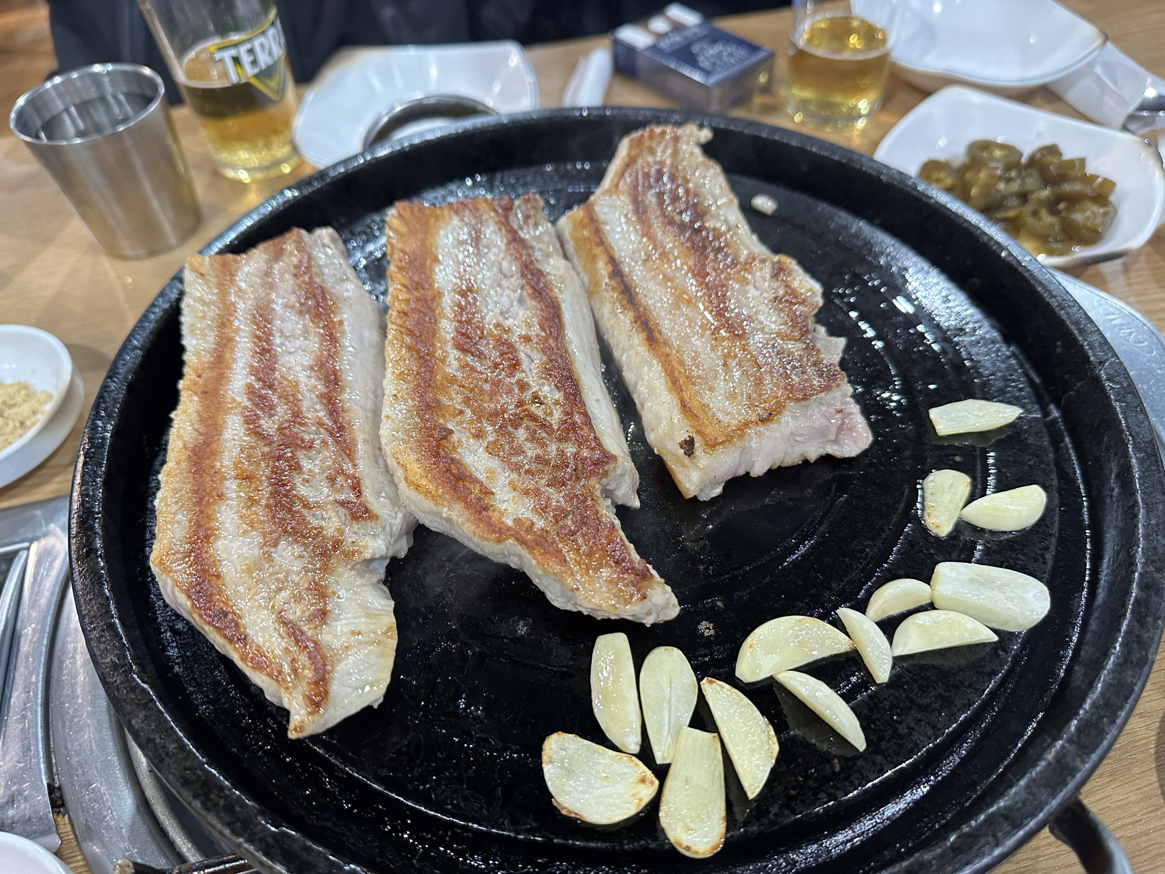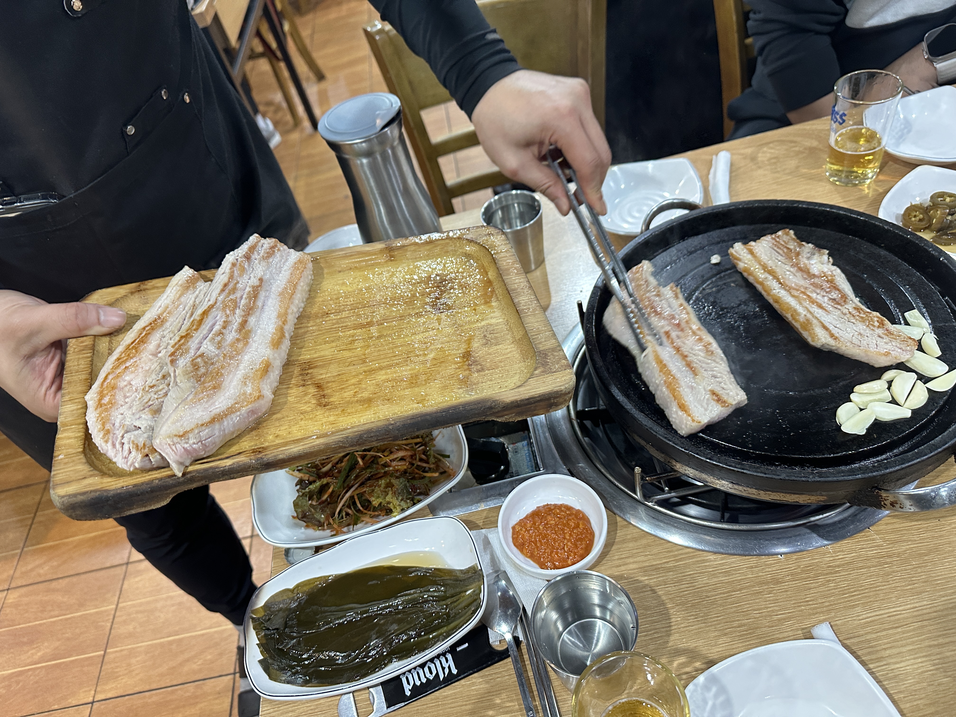 저녁시간이 되면 자리를 안내해주시는데 절대 불판을 만지면 안됩니다. 장사가 워낙 잘되고 빈자리가 보이지 않는 곳이기 때문에 저녁시간부터 불판에 열을 가하고 있기 때문에 앉자마자 불판에 열을 올리지 않고 고기를 먹을 수 있으니 불판은 절대 만지면 안됩니다.