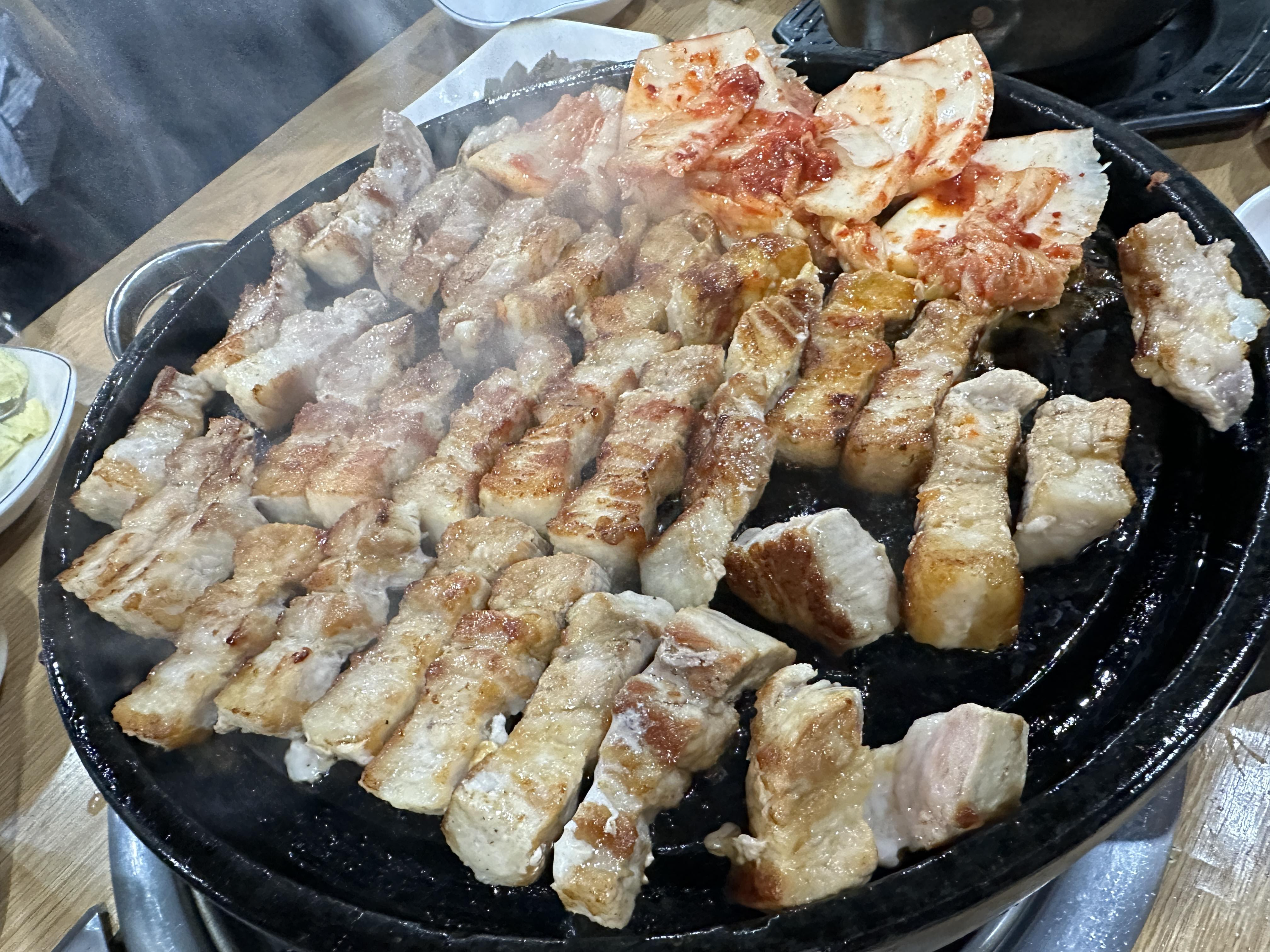 고기는 옆면만 익으면 먹어도 되는데요. 여기에 김치가지 구워주시는데 국물이 많은 김치 타입이 아님 아삭 아삭한 김치와 삼겹살의 조합이 정말 좋은데요. 소맥과 한 번 먹으면 최고의 맛을 보여주는 그런 맛을 보여주는 곳입니다.