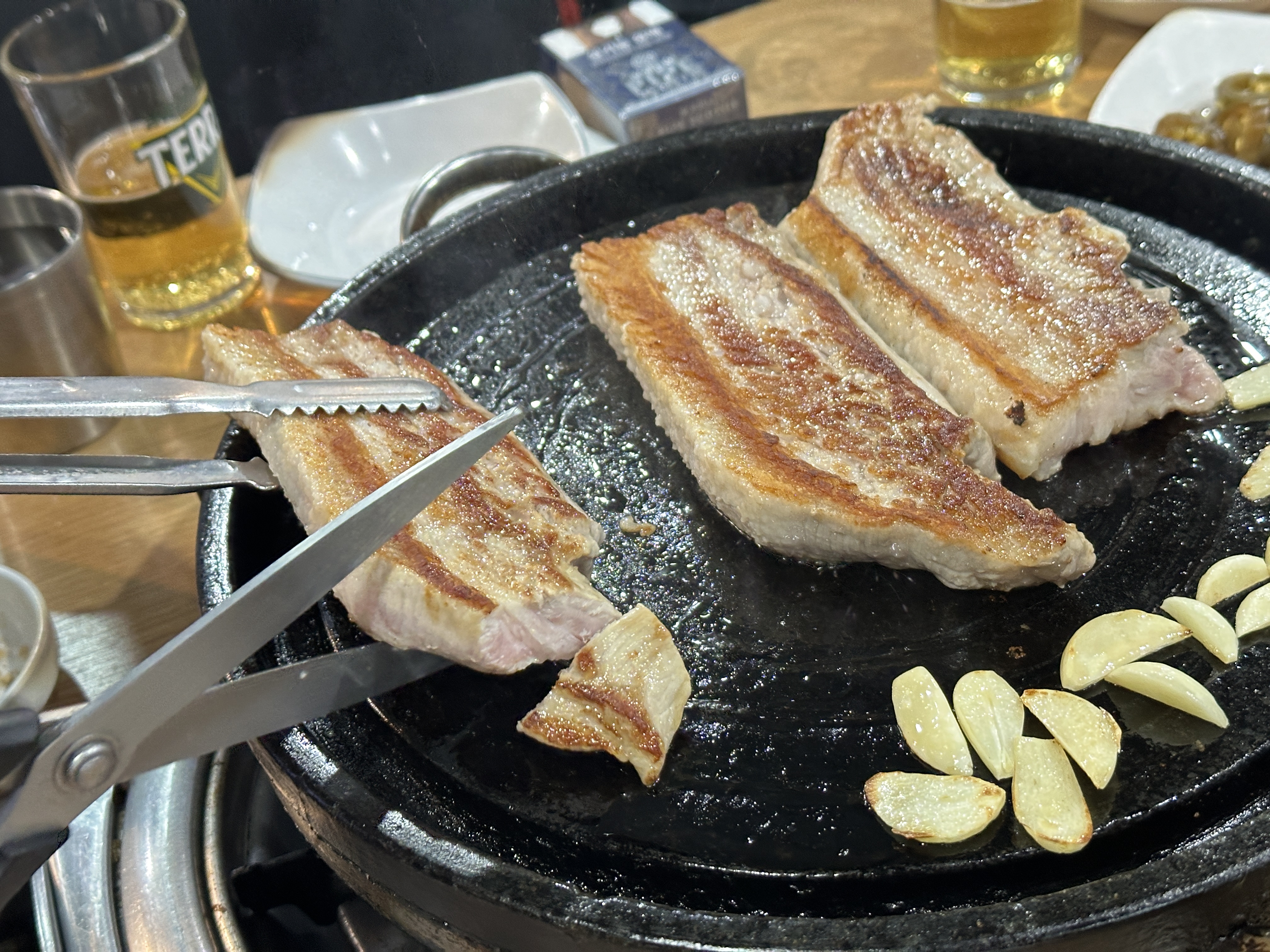 겉이 바삭 바삭한 고기는 꽤나 매력적이고 여기에 마늘까지 구워주신다면 최고의 맛을 보여주는 삼겹살을 만날 수가 있습니다. 이제 하나 하나 잘라서 옆면만 살짝 더 구워주시면 되는데요. 삼겹살 맛집인 이 곳 삼겹사랑은 한 번 찾아오면 또 다시 찾고 싶어지는 맛을 가지고 있는 곳이라서 정말 매력적인 곳이라 이야기하고 싶습니다.