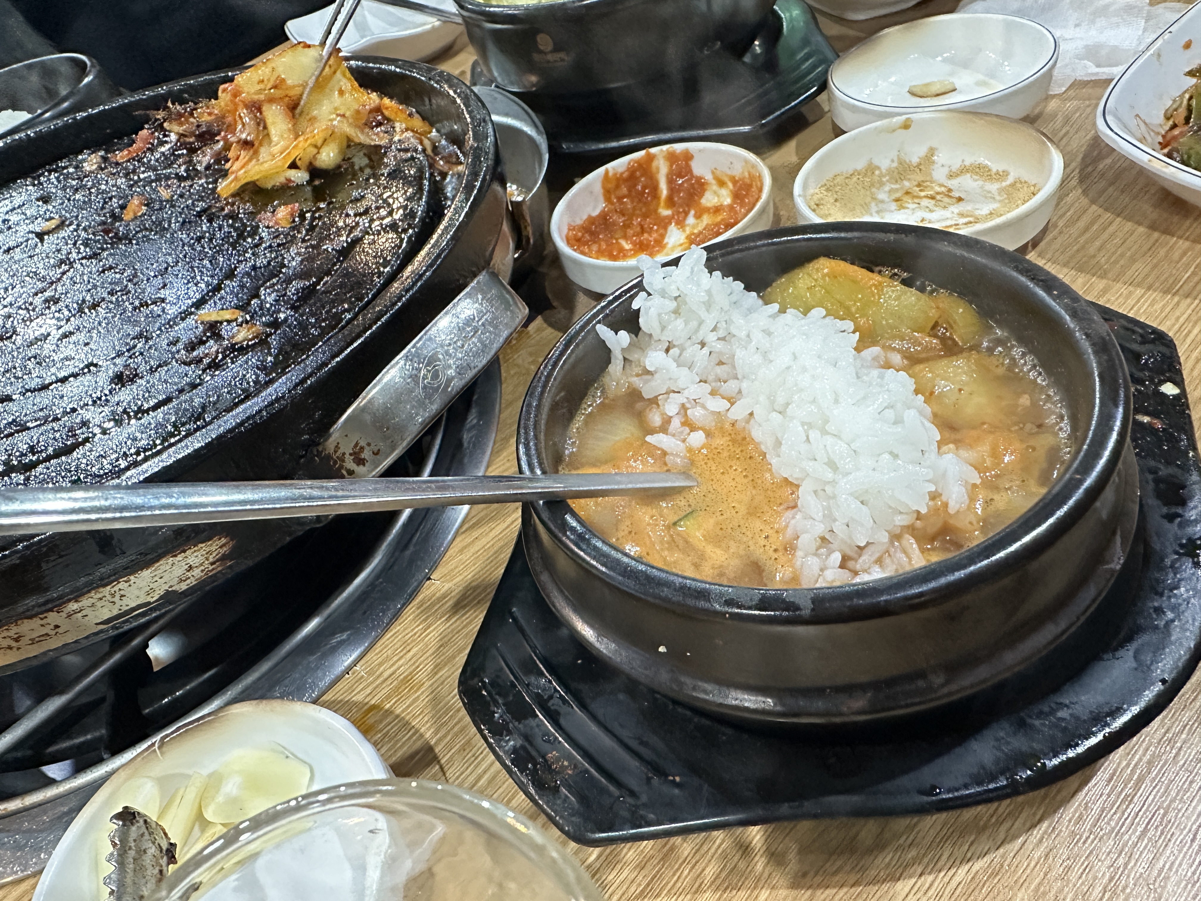 된장찌개에 이렇게 밥을 넣어서 된장술밥을 만드는건 단골만 아는 비밀 ~!!! 이렇게 꼭 먹어보시면 정말 좋은데요.