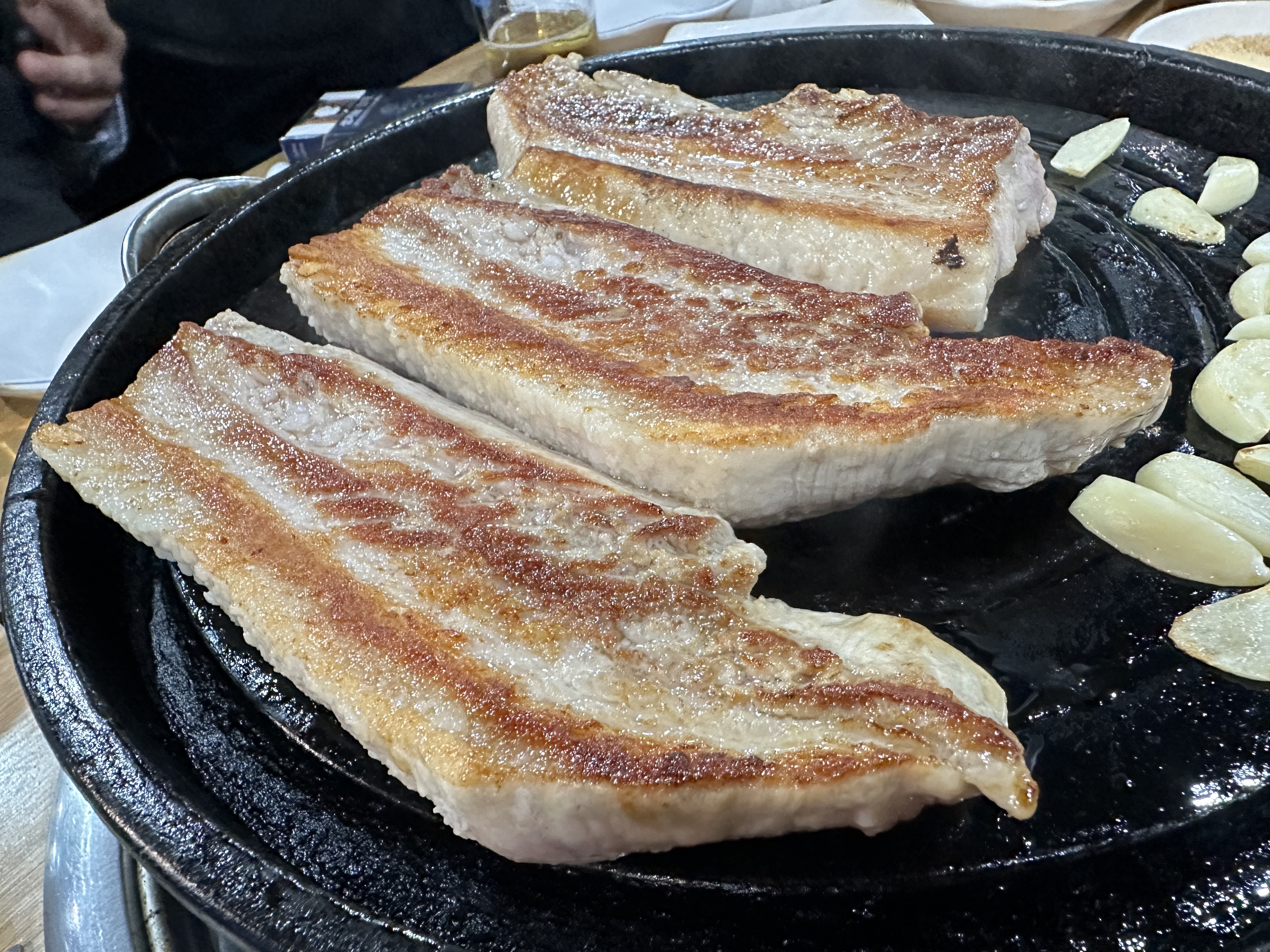 삼겹살을 사진으로만 보더라도 이 곳이 왜 양재동 삼겹살 맛집인지를 알 수 있는 곳인데요. 겉은 바삭하고 속은 야들야들한 삼겹살의 맛이 인기가 좋습니다. 일단 불판이 정말 좋다고 생각합니다. 불을 켜고 온도가 올라오지 않는데 고기를 굽는 형태가 아닌 한참 열을 먹인 불판에 초벌한 고기로 2차로 굽기 때문에 육즙이 어느정도 살아 있기 때문입니다.