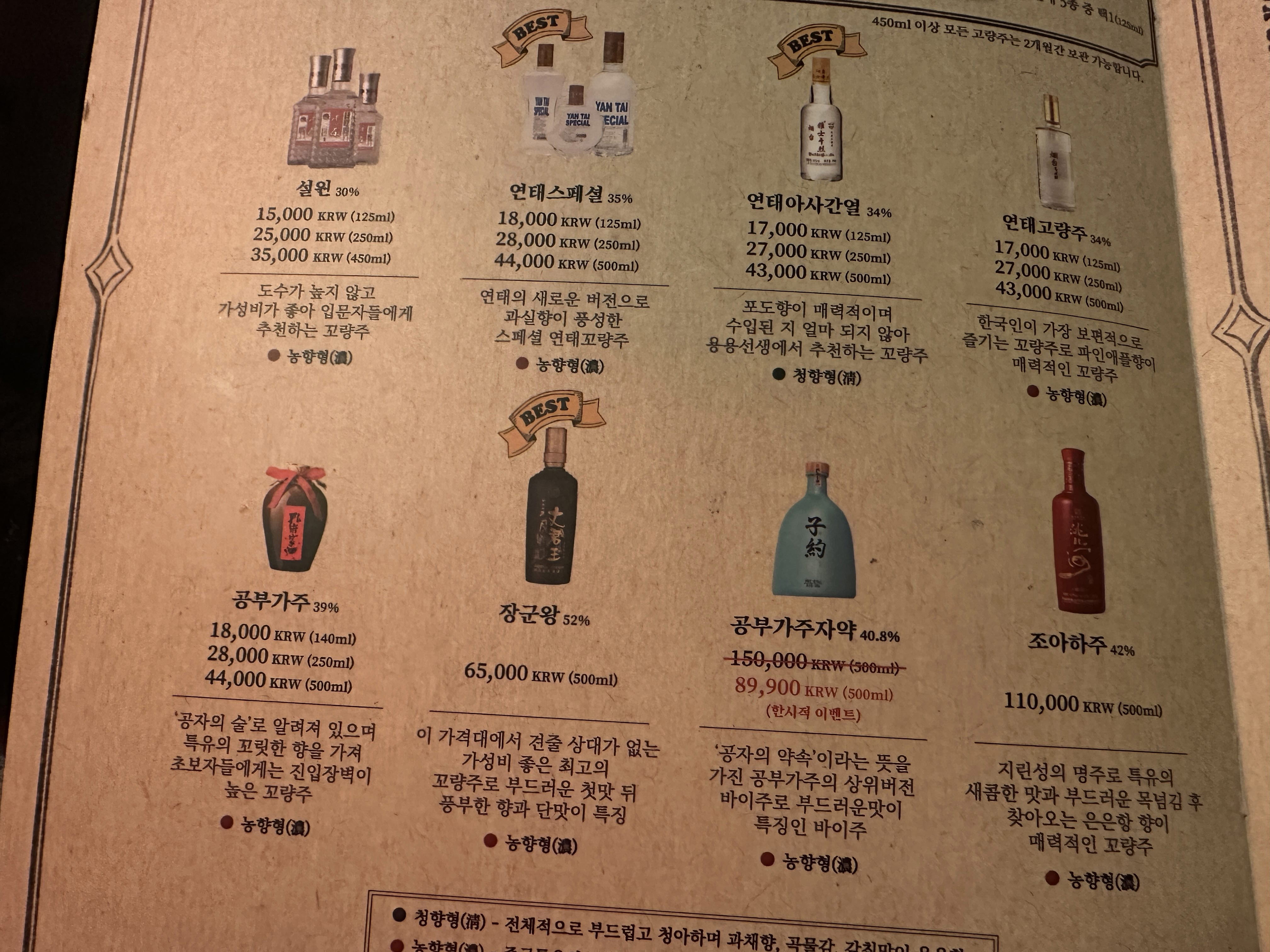 용용선생에서는 이 뿐만 아니라 다른 곳에서 보기 힘든 장군왕 / 공부가주자약 / 조아하주 / 연태아사간열 등 보기 힘든 다양한 고량주부터 우리가 쉽게 먹을 수 있는 연태고량주 그리고 최근에 핫하게 뜨고 있는 설원까지 다양한 제품들을 마실 수 가있는데요. 가격도 그렇게 높은 편은 아닙니다.