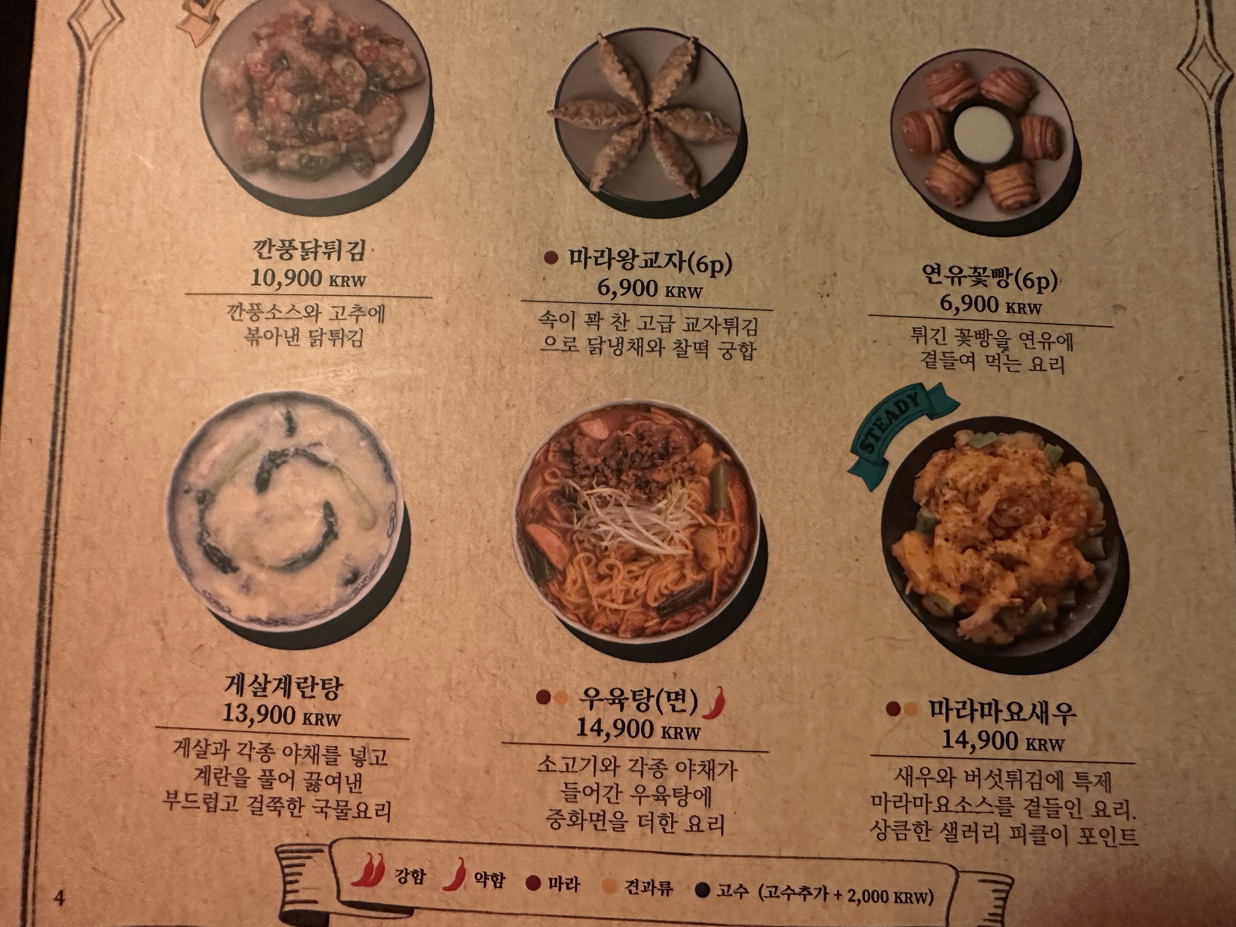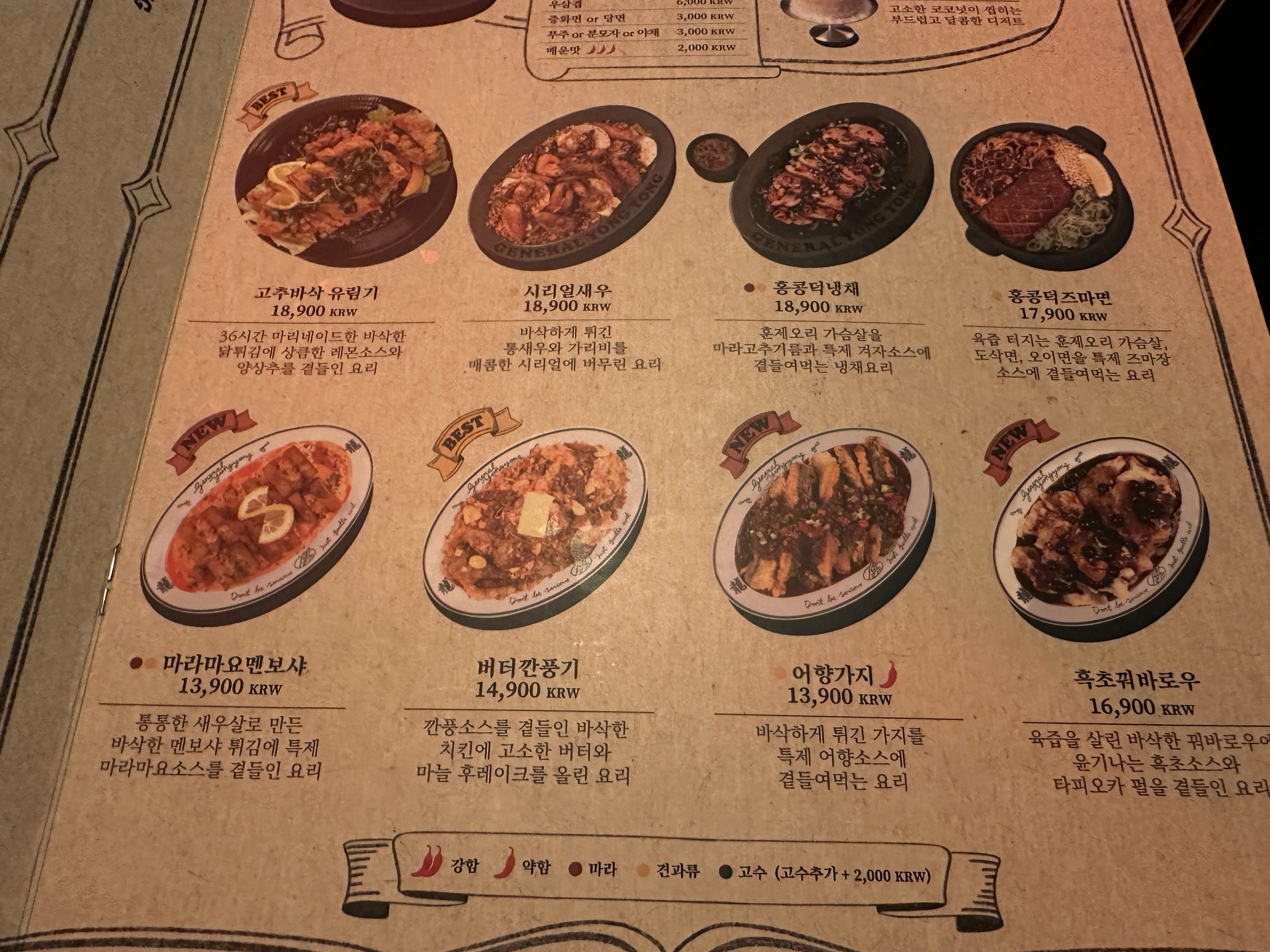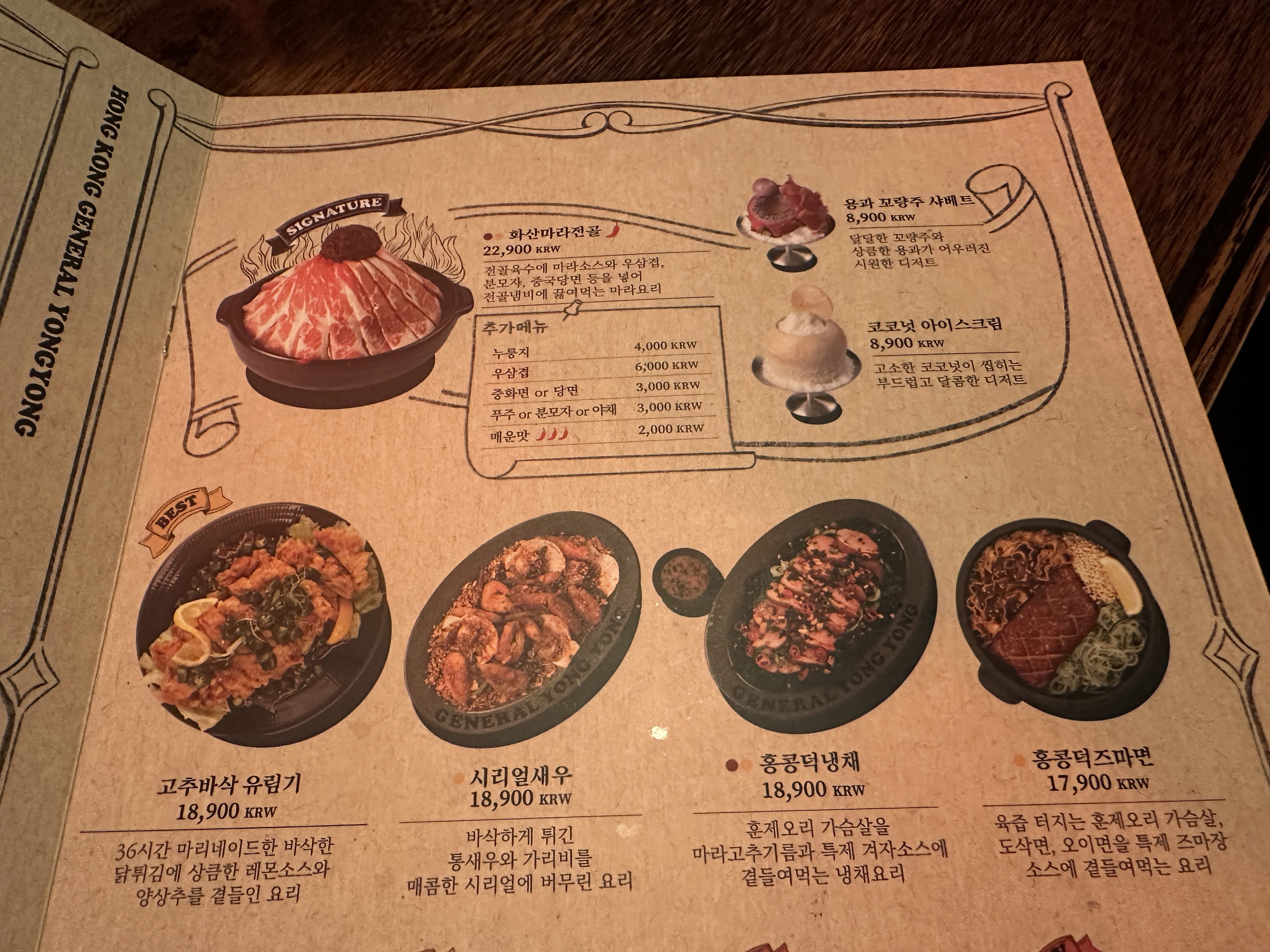 요리류를 보면 화산마라전골 / 고추바삭유림기 / 시리얼새우 / 홍콩덕냉채 / 홍콩덕즈마면 등 홍콩을 상징하는 음식들로 구성이 잘되어있습니다. 메뉴판부터 시작해서 전체적인 느낌이 상당히 홍콩스러운 느낌인데요. 용과 꼬량주 샤베트 같은 다른 곳에서 먹어볼 수 없는 이색 안주까지 정말 다양합니다.