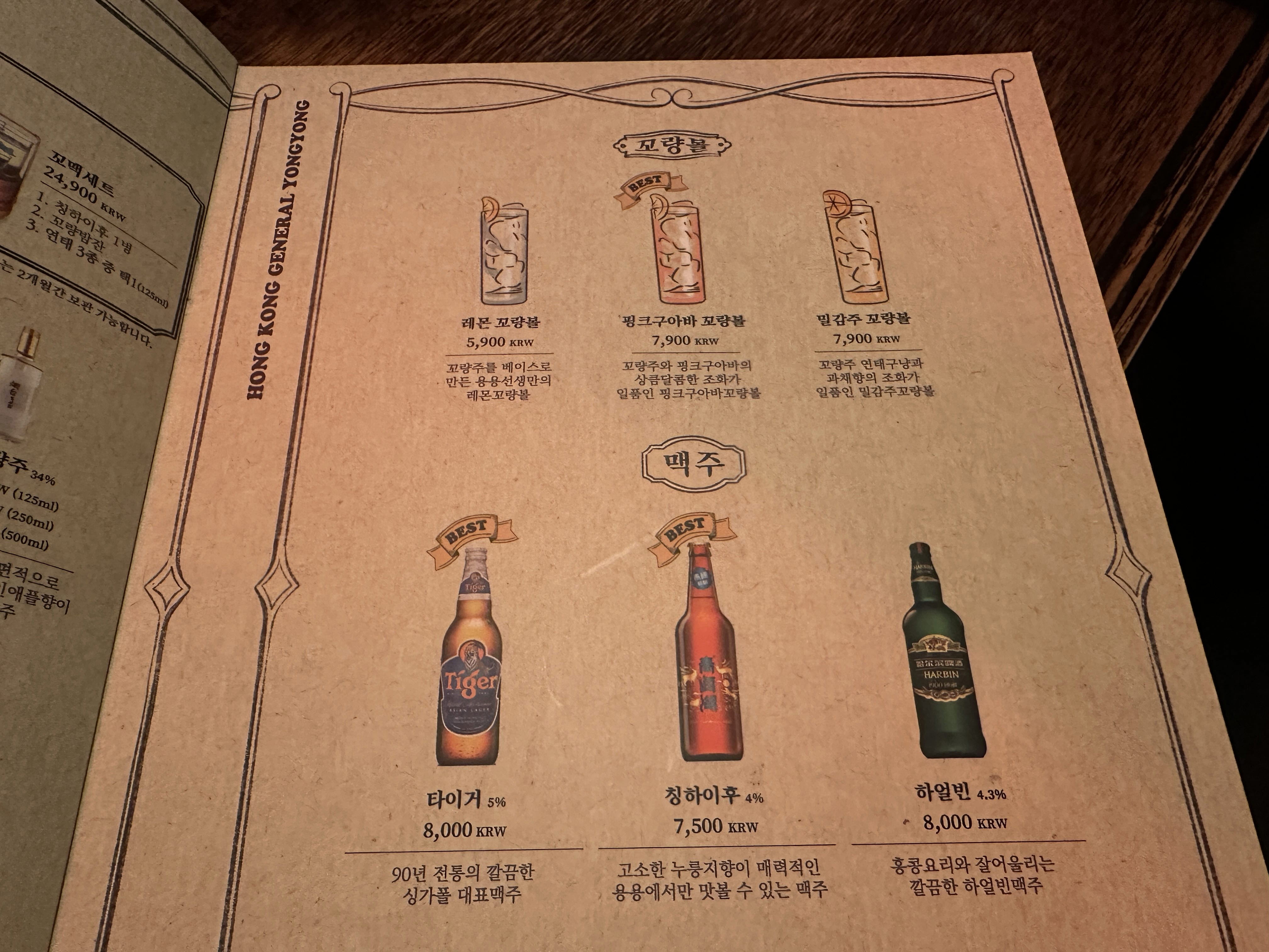 요즘 유행하고 있는 연태고량주를 베이스로 만든 하이볼인 꼬량볼도 마실 수가 있으며 타이거 / 하얼빈까지 칭하이후와 더불어 좀 더 이색적인 느낌을 주기 위해서 중국 라인업 맥주까지 마셔볼 수가 있습니다. 고량주와 함꼐 핑크 구아봐의 상큼한 핑크 구아바 꼬량볼 추천합니다.