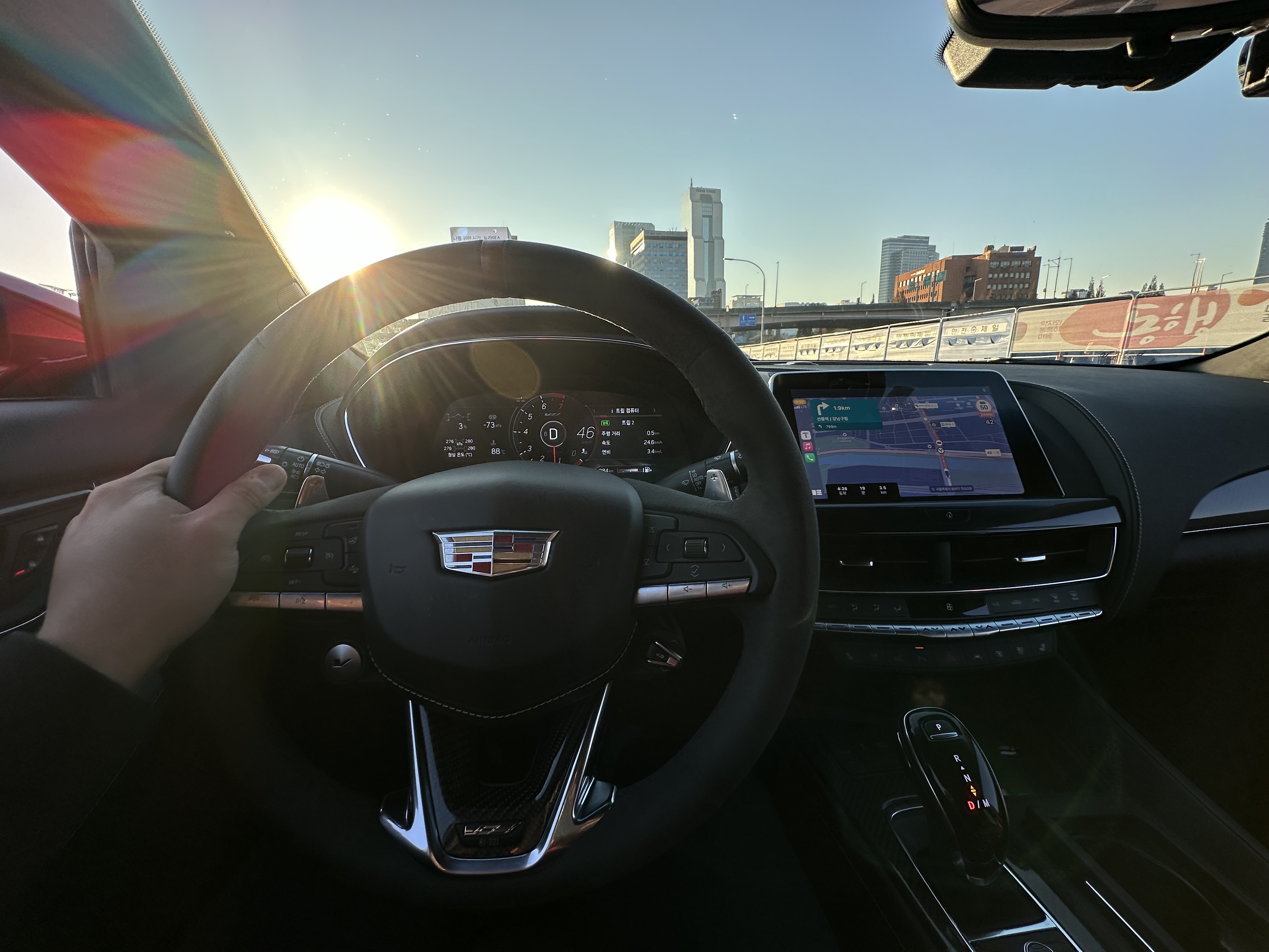 캐딜락 CT5-V 블랙윙 실내는 어떨까요? 스티어링 휠은 알칸타라 그리고 카본 재질로 구성되어 있어 조금 더 고급스러운 느낌을 보여주고 있습니다. 또한 기본 모델과 다른 점은 고성능 V 버튼과 트랙션 버튼이 있다는 점이 있는데요. 6.2리터 슈퍼차져 엔진이지만 생각보다 배기음은 조용한 편입니다.