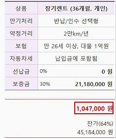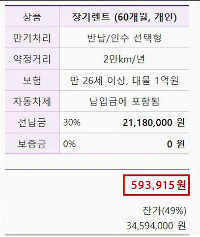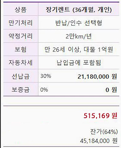 우선 동일한 차량에 선납금 30% 2,118만원을 넣어보겠습니다. 36개월을 이용하는 경우라면 515,169원 60개월을 이요한다면 59,3,915원으로 선납금을 넣고 짧게 이용하면 훨신더 이익이다. 즉 자동차 장기렌트 선수금 (선납금)을 많이 넣어야하는 사람들은 차량을 짧게 36개월정도 이용하는 사람들에게 정말 유리한 구조이며 개인 신용도나 차량 종류에 따라 달라 질 수가 있다.