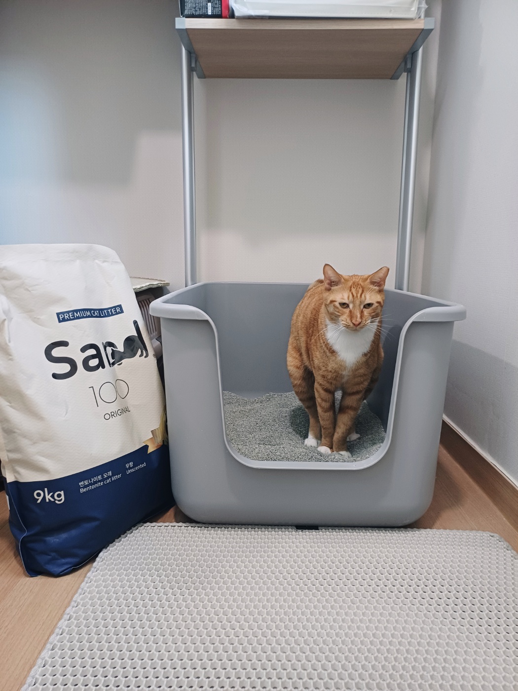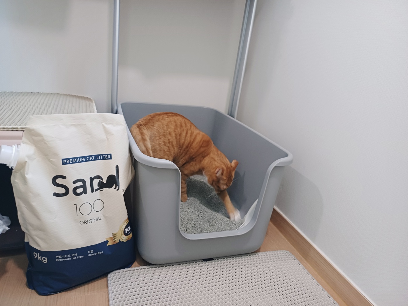 생각보다 모래 위에서 많이 움직이는 녀석 때문에 먼지없는 고양이 모래로 샌드백 (sand 100)제품을 선택했는데 집사도 마음에 들고 냥이 도 마음에 드는 모습을 볼 수가 있다.