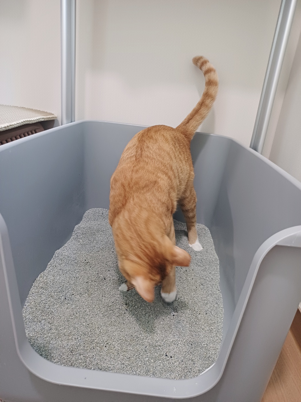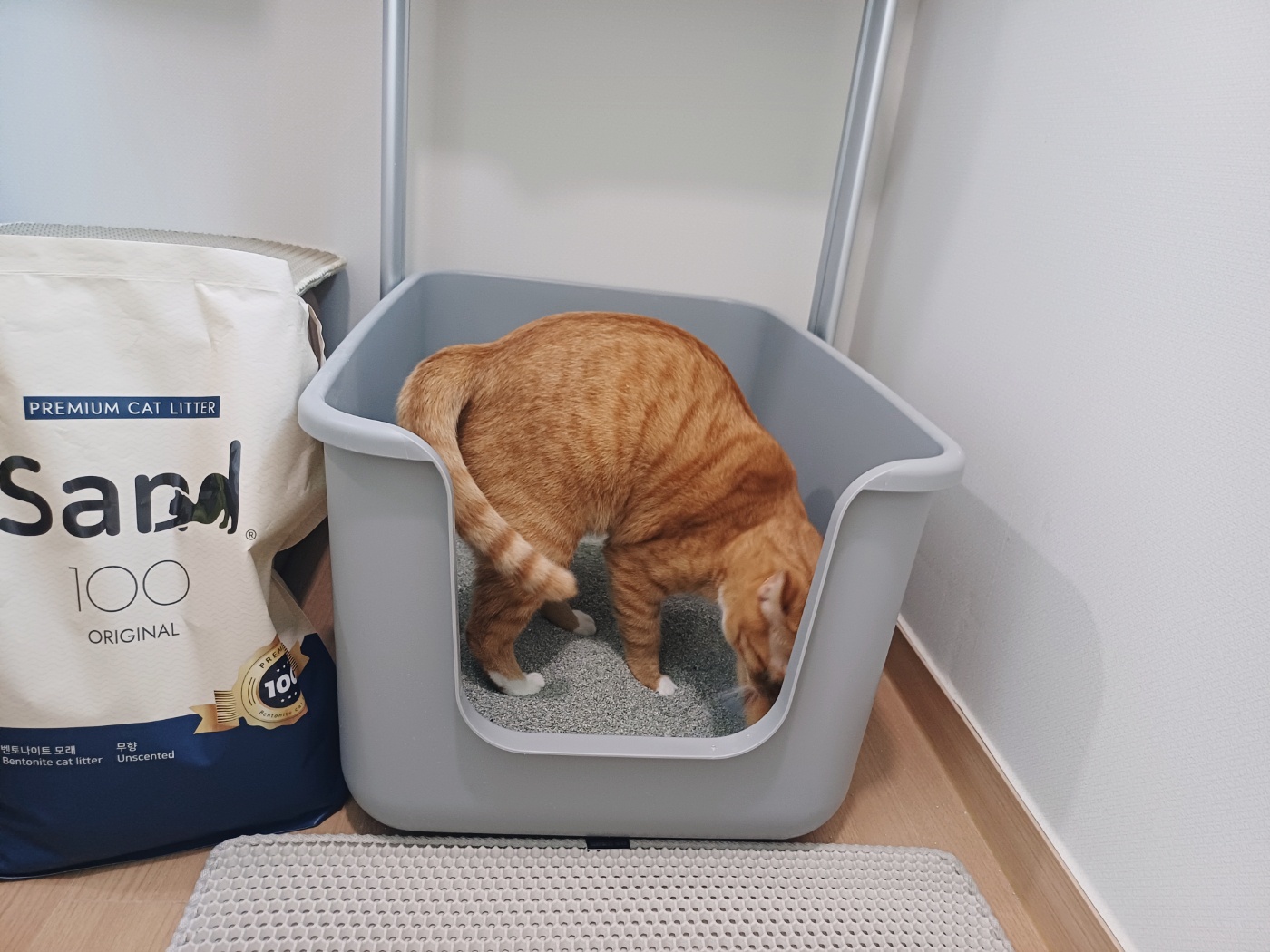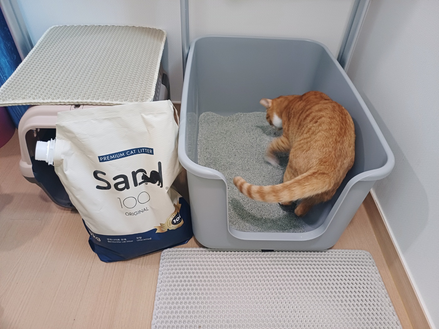생각보다 모래 위에서 많이 움직이는 녀석 때문에 먼지없는 고양이 모래로 샌드백 (sand 100)제품을 선택했는데 집사도 마음에 들고 냥이 도 마음에 드는 모습을 볼 수가 있다.