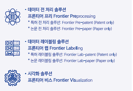 아무르의 핵심 기술인 데이터 전처리 솔루션 프론티어 프리와 데이터 레이블링 솔루션 프론티어 랩 그리고 시각화 솔루션인 프론티어 비스 기술을 통틀어 프론티어 솔루션으로 전세계 기업들의 표준화된 기업 정보 그리고 금융 / 특허 / 논문 정보를 검증된 DB로 활용하여 연구개발과 금융투에 필요한 다양한 인사이트를 도출하고 있다.