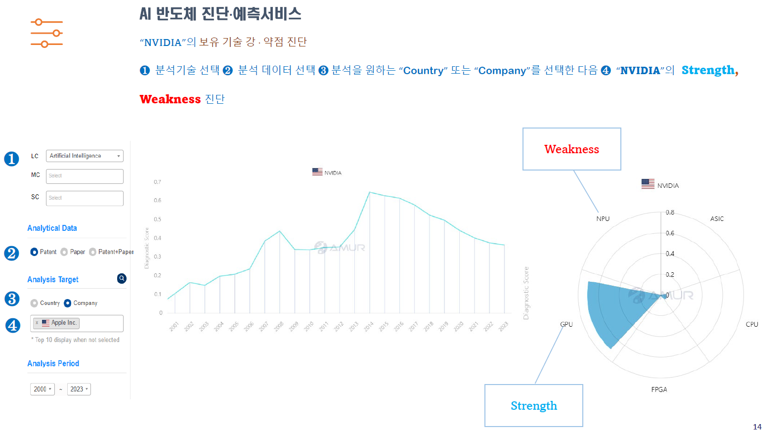 예를들면 AI 반도체 기업인 NVIDIA 보유 기술에 대한 강점과 약점은 진단 / 예측하는 서비스를 간단히 살펴보면 분석 기술을 선택하고 그 기술에 대흔 분석 데이터를 선택 다음으로 지역과 회사를 선택하고 강점과 약점을 진단하면 한 눈으로 AI 반도체 진단 및 예측이 가능한 서비스라고 보면된다.