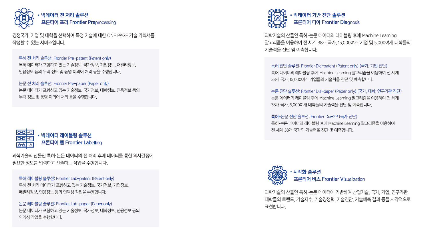아무르의 핵심 기술인 데이터 전처리 솔루션 프론티어 프리와 데이터 레이블링 솔루션 프론티어 랩 그리고 시각화 솔루션인 프론티어 비스 기술을 통틀어 프론티어 솔루션으로 전세계 기업들의 표준화된 기업 정보 그리고 금융 / 특허 / 논문 정보를 검증된 DB로 활용하여 연구개발과 금융투에 필요한 다양한 인사이트를 도출하고 있다.