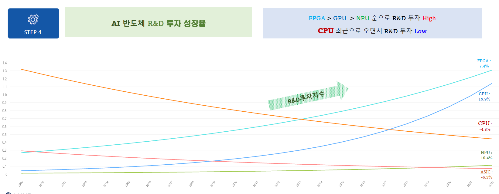 예시로 AI 반도체 R&D 투자 성장율을 살펴보면 2000년부터 지금까지 약 20여년 간 AI 반도체 투자 성장율 / 기술 혁신지수 / 시장 확장지수 등을 확인할 수 있는데 투자 성장율만 놓고 본다면 CPU는 최근 투자 성장율이 마이너스를 보여주고 있으며 FPGA > GPU > NPU 순서로 R&D 투자가 높다는 것을 알 수 있다.