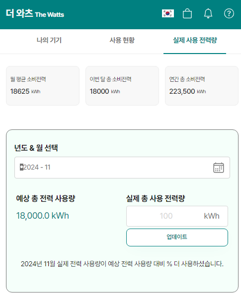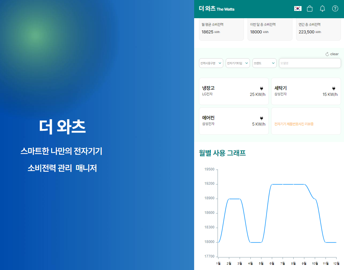 더와츠는 월별 실제 전력 사용량을 내가 입력한 예상 사용랴오가 비교하면서 어떤 전자기기에서 불필요하게 전력이 소비가 되었는지 확인이 가능하다. 특히나 이용자가 직접 매월 사용량을 저장하면서 실제로 전력 사용량을 효율적으로 줄일 수도 있는데 현재 환경부에서 시행하는 에코마일리지 같은 정부 인센티브 제도를 연계할 수 있도록 향후 지원 예정이다.