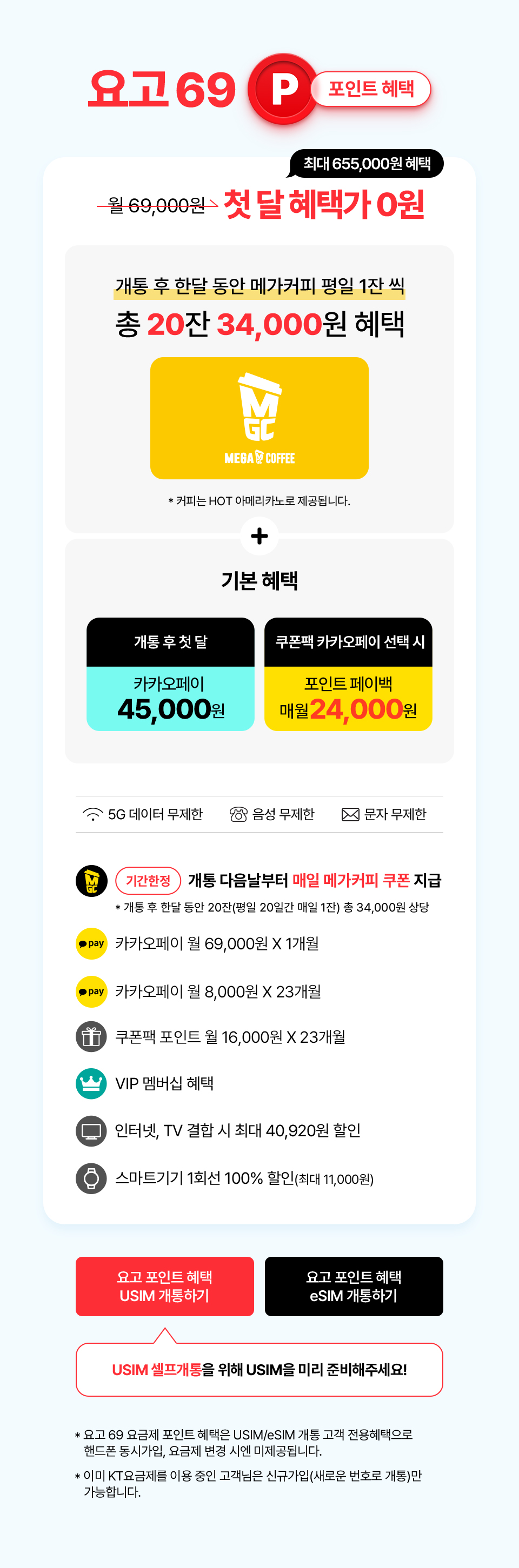 :::: 최대 655,000원 상당의 압도적 포인트 혜택 구조 요고 69P 포인트 혜택의 세부 내역을 살펴보면 그 규모에 다시 한번 놀라게 됩니다. 가입 첫 달 카카오페이 69,000원 페이백을 시작으로 이후 23개월 동안 매월 8,000원씩 총 184,000원이 추가 지급됩니다. 여기에 매월 16,000원 상당의 쿠폰팩 혜택이 23개월 동안 더해지면 전체 혜택 규모는 최대 655,000원까지 늘어납니다. 이는 시중의 그 어떤 KT 요금제와 비교해도 독보적인 수준의 혜택입니다.