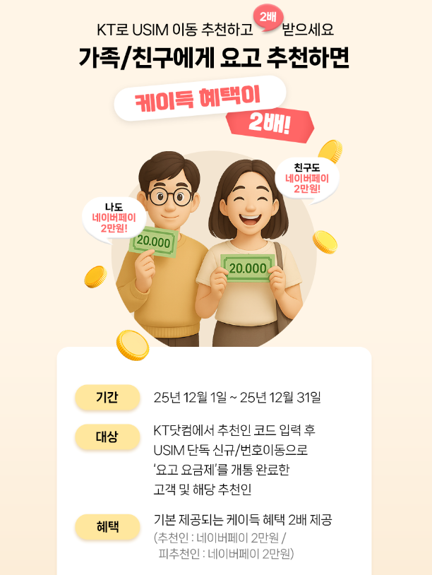 :::: 추천인 제도와 케이득 2배 혜택 지인이나 가족에게 KT 유심 교체를 권유하고 싶다면 이번 추천 이벤트를 적극 활용해야 합니다. 12월 1일부터 12월 31일까지 추천인 코드를 입력하고 요고 요금제를 개통하면 추천인과 피추천인 모두에게 네이버페이 20,000원을 증정합니다. 이는 기존 케이득 혜택 대비 2배로 상향된 보상으로 합리적인 통신 생활을 지인과 공유할 수 있는 좋은 기회입니다.