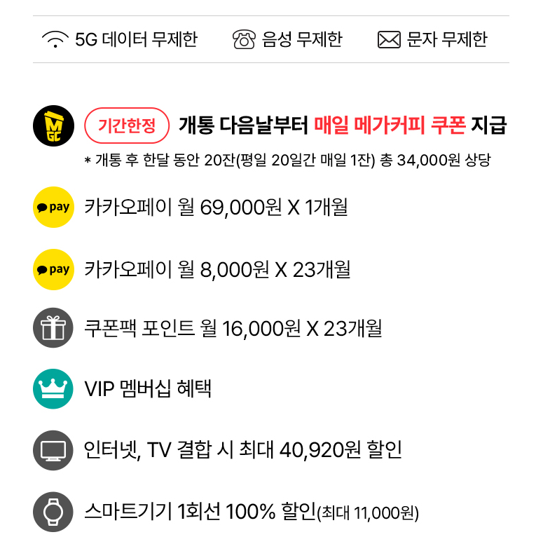 :::: 출근길의 즐거움 메가커피 매일 증정 이벤트 단순한 요금 혜택을 넘어 유저들의 라이프스타일을 지원하는 실생활 밀착형 혜택도 존재합니다. 개통 다음 날부터 평일 기준 매일 1잔씩 한 달 동안 총 20잔의 메가커피 핫 아메리카노 쿠폰이 발송됩니다. 이는 약 34,000원 상당의 가치를 지니며 직장인이나 학생들의 아침을 챙겨주는 실질적인 지원책입니다. 개통 익일 오후 5시 이후 쿠폰이 발송되며 금요일 개통 시에는 다음 주 월요일부터 지급된다는 상세 조건도 확인이 필요합니다.