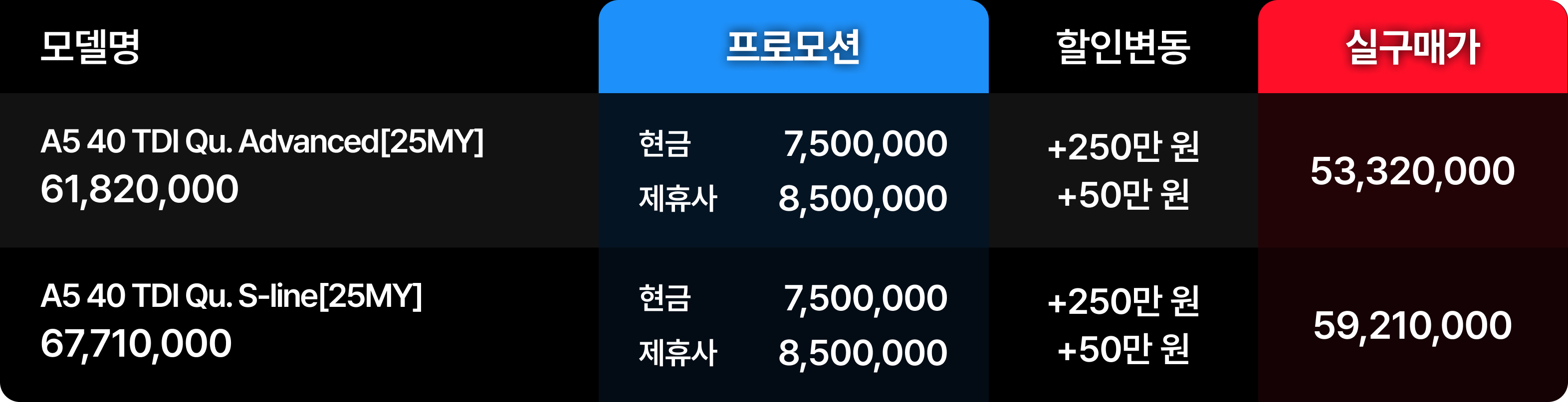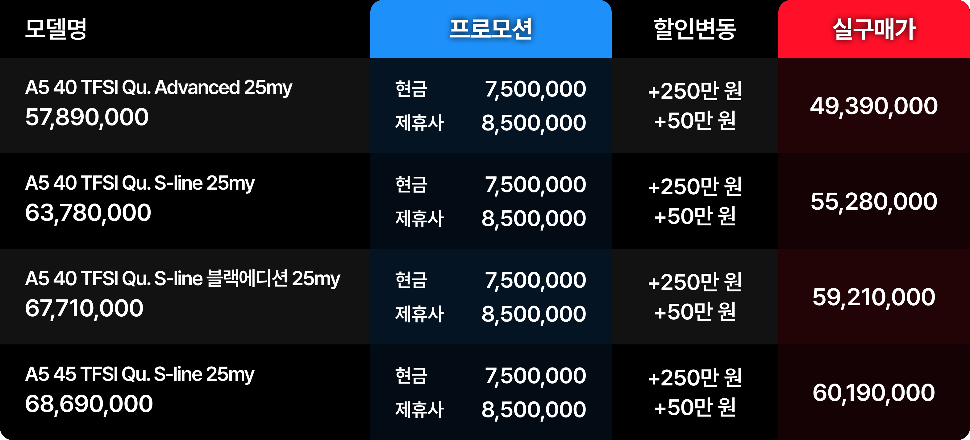 디젤 모델인 아우디 A5 40 TDI 콰트로 어드밴스드 역시 동일한 수준의 프로모션을 유지하고 있다. 장거리 주행이 많고 높은 토크를 선호하는 운전자에게 적합한 이 모델은 할인을 적용받아 53,320,000원에 구매가 가능하다. 가솔린 모델 대비 높은 연비 효율을 고려한다면 경제적 가치는 더욱 상승하게 된다.