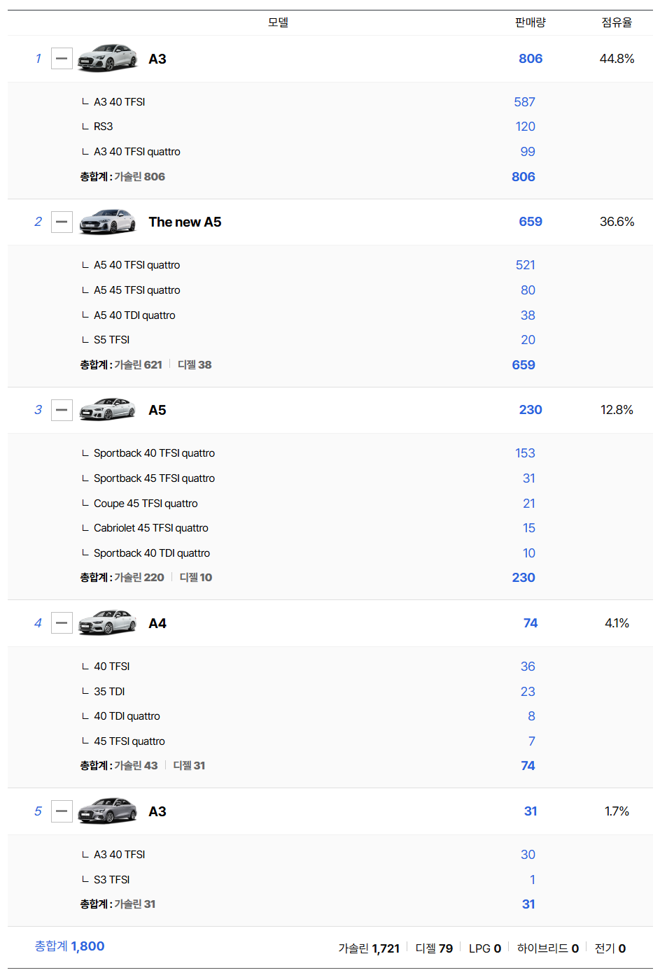 중형 세단 시장의 강자인 아우디 A5 라인업 또한 주목해야 한다. 2025년 통계에 따르면 더 뉴 A5는 659대 기존 A5는 230대가 판매되며 브랜드 내 허리 역할을 충실히 수행했다. 특히 40 TFSI 콰트로 트림이 전체 판매의 상당 부분을 차지하며 스타일과 성능의 균형을 중시하는 3040 세대의 절대적인 선택을 받았다.