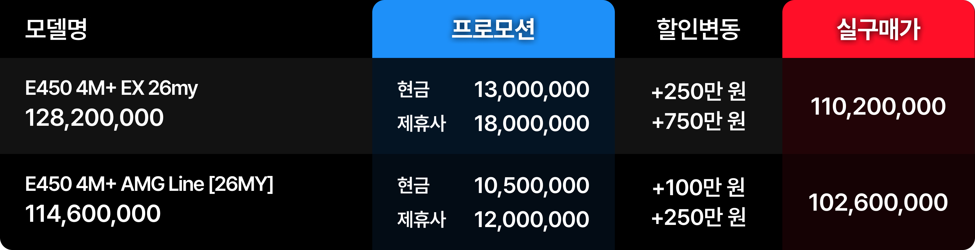 최상위위 트림인 E450의 할인 증가는 상위 세그먼트의 시장 점유율을 확대하려는 전략적 포석이다.