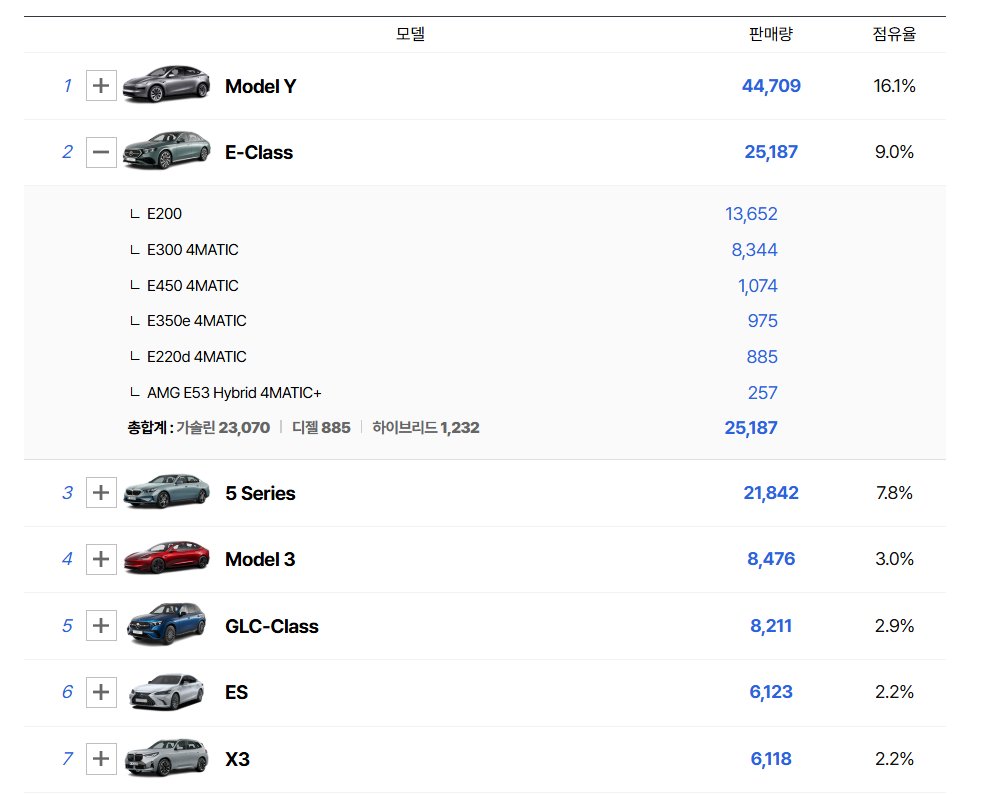총 25,187대의 판매고 중 E200 모델이 13,652대를 차지하며 엔트리 트림의 강력한 시장 지배력을 입증했다.