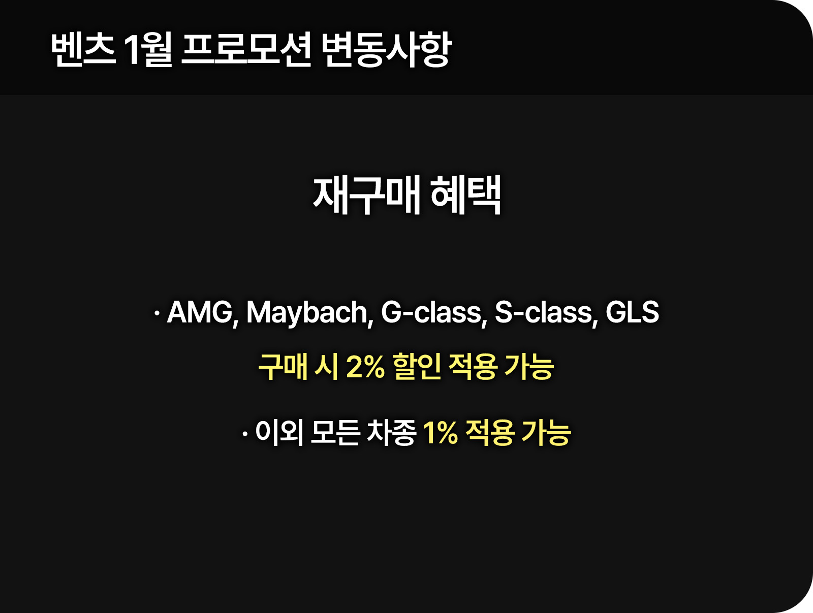 재구매 혜택을 통해 상위 모델인 AMG나 Maybach S클래스 구매 시 2%의 추가 할인을 제공하며 그 외 일반 차종은 1%를 적용한다. 이는 브랜드 로열티를 강화하고 지속적인 기변 수요를 창출하려는 목적이다.