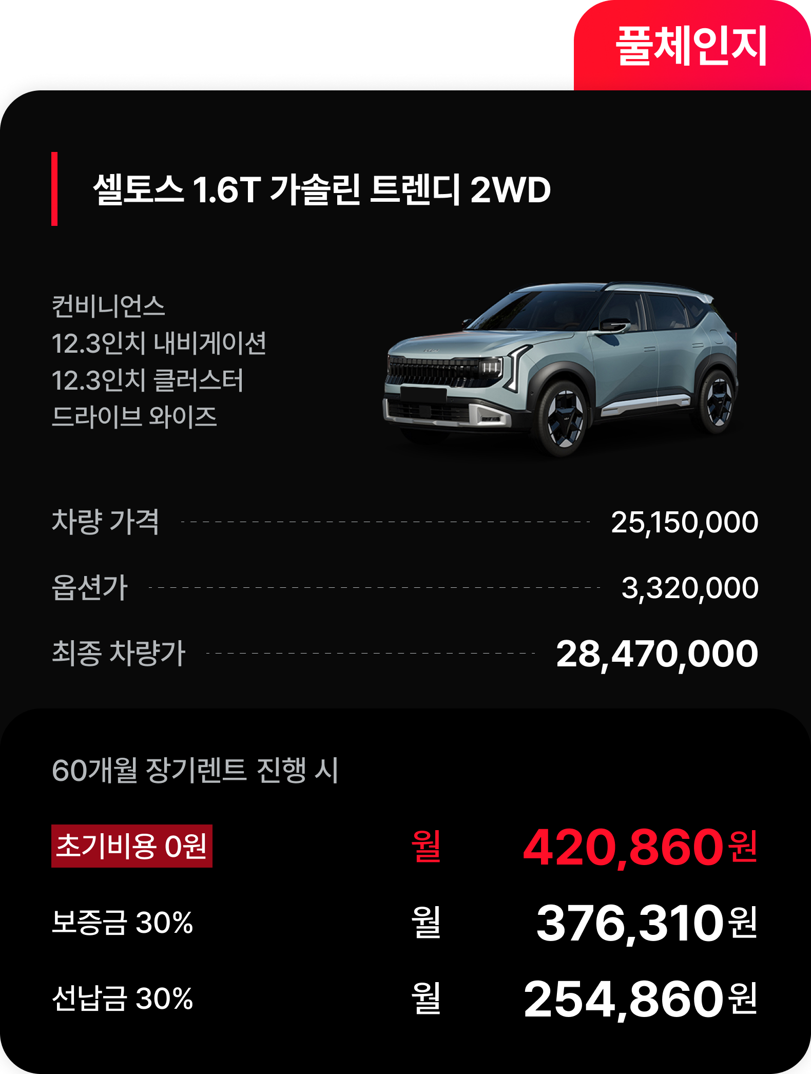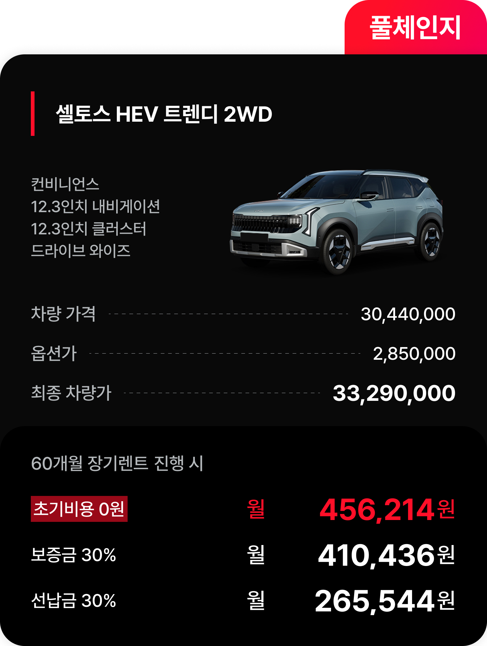 결론적으로 셀토스 장기렌트를 고민하는 사용자에게 하이브리드는 선택이 아닌 필수적인 합리성이다. 초기 부담금이 적은 렌트 상품의 특성과 하이브리드의 높은 잔존 가치가 결합되었을 때, 소비자가 누릴 수 있는 혜택은 극대화된다. 에이원오토의 견적 데이터가 증명하듯, 월 3만 원대의 추가 비용으로 얻을 수 있는 유류비 절감과 압도적인 주행 품질은 그 어떤 옵션보다도 가치 있는 투자다.